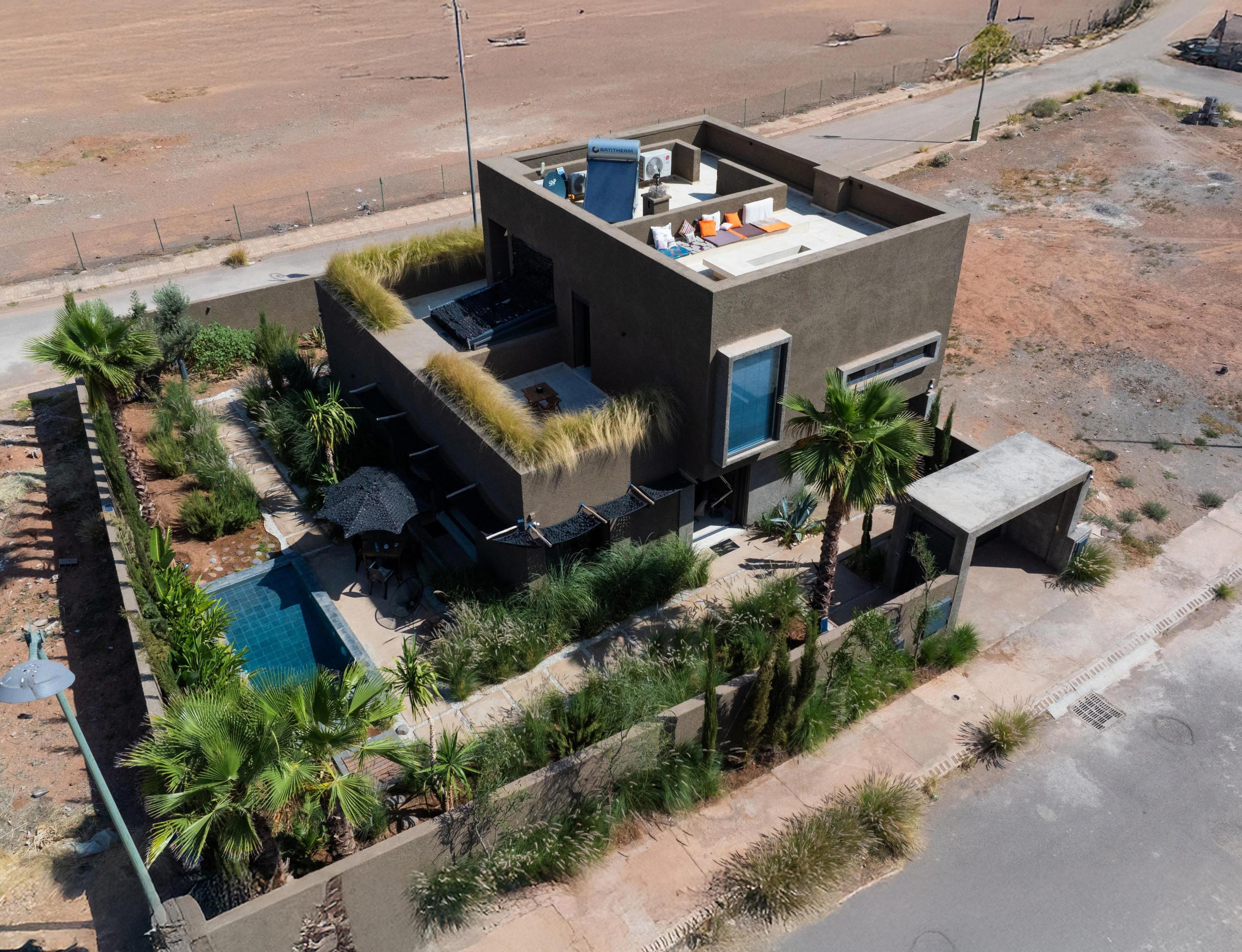 NICHE AU COEUR DU QUARTIER RESIDENTIEL DE MARRAKECH TRES PRISE PAR LES FAMILLES EN QUETE DE NATURE CETTE DEMEURE SE VEUT RESOLUMENT CONTEMPORAINE ET MINIMALISTE A LA FOIS. L’UTILISATION D’UNE TONALITE MONOCHROME MET EN VALEUR LE JARIDN TOUT EN SUBLIMANT LA PISCINE.