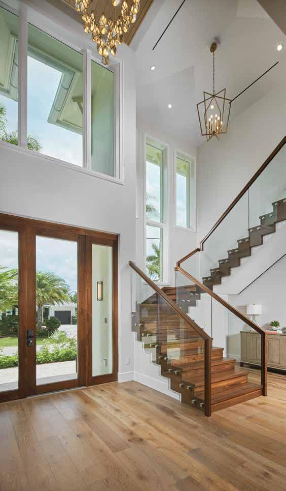 The airy foyer benefits from light streaming in the glass front door banded in Honduran Mahogany. The walnut staircase features stainless steel grommets holding glass panels beneath a walnut banister. From the ceiling, which soars in excess of 20 feet, hangs two chandeliers. Over the stairs, a Kichler open cage brass chandelier in a honey gold finish and the other, is suspended from a tongue and groove, stained wood ceiling. The Mercury glass and antique brass fixture with glowing prisms is by Currey & Company. The wide plank floor is from the Santa Monica Collection by Sawgrass Mills.