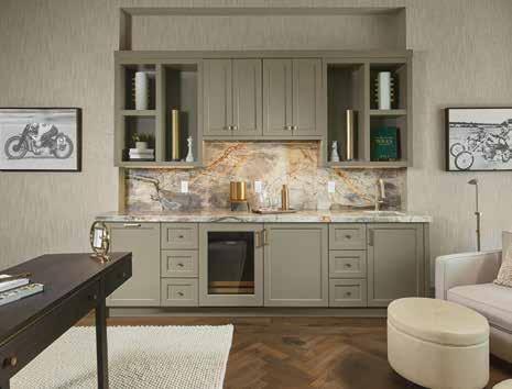 The alcove of the club room, a flexible space which can be both office and entertainment area, hosts built-in cabinetry, painted a gray green, with an undercounter ice maker, Sub-Zero wine refrigerator and storage spaces. Victoria Blue quartzite adorns the backsplash and countertop, which has a convenient prep sink. Surrounding walls are covered in Phillip Jeffries grasscloth and further textural interest is added by the herringbone Milky Way oak flooring.