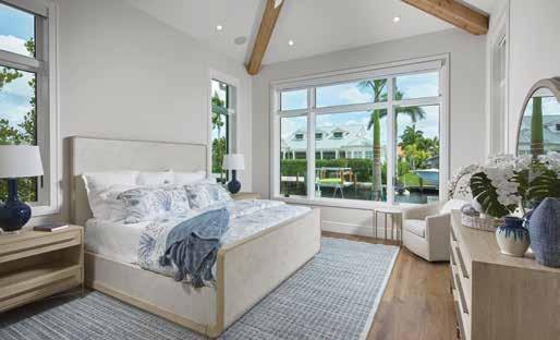 The spacious 18 by 14-foot primary bedroom is a study in understated elegance. The king bed is wrapped in textured linen and banded in birchwood to match the elongated nightstands and chest. Custom cotton linens echo the color of the twin porcelain lamps, the color of which is reproduced in the muted area rug. A club chair in ivory linen adds the perfect vantage point to overlook the water. Overhead a design of vintage oak adds interest to the ceiling.