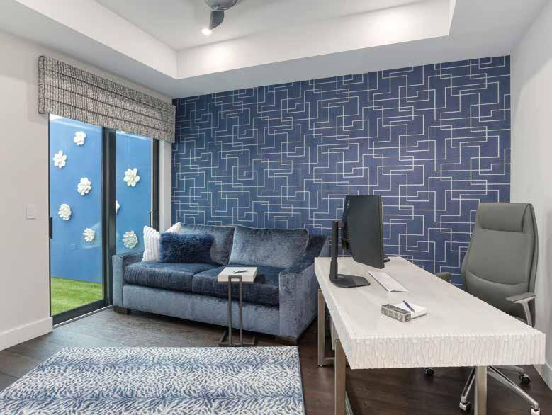 Press was able to use one of the downstairs bedrooms to create a comfortable home office. The focal point of the room is the fun and vibrant geometric wallpaper. This blue theme is continued through the comfortable loveseat and then moves outside into a courtyard area Press completely transformed. “The original space was so cold and stark with pavers and walls the same boring light beige,” says Press. “I used astroturf to add color and a more natural feel that’s easy to maintain, painted the wall this relaxing blue color to match both the living room and office, and then found these fun, sculptural pieces that the owners love.”