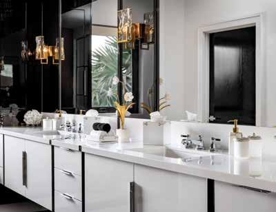 Just beyond the beautiful foyer, slack velvet channel wall panels with matching banquet, constructed by LMD, and a custom-made white leather curved sofa which graciously set the tone for the main living area with perfect proportion. The curved lines of the sofa and chairs soften the black and white color palette, keeping the sleek room comfortable. Another stunning, glass light fixture hangs over the space. A Stuart coffee table from the Lori Morris furniture collection was custom made to match the proportions of the sofa and room’s color palette separates the seating with a lounge feel atmosphere.