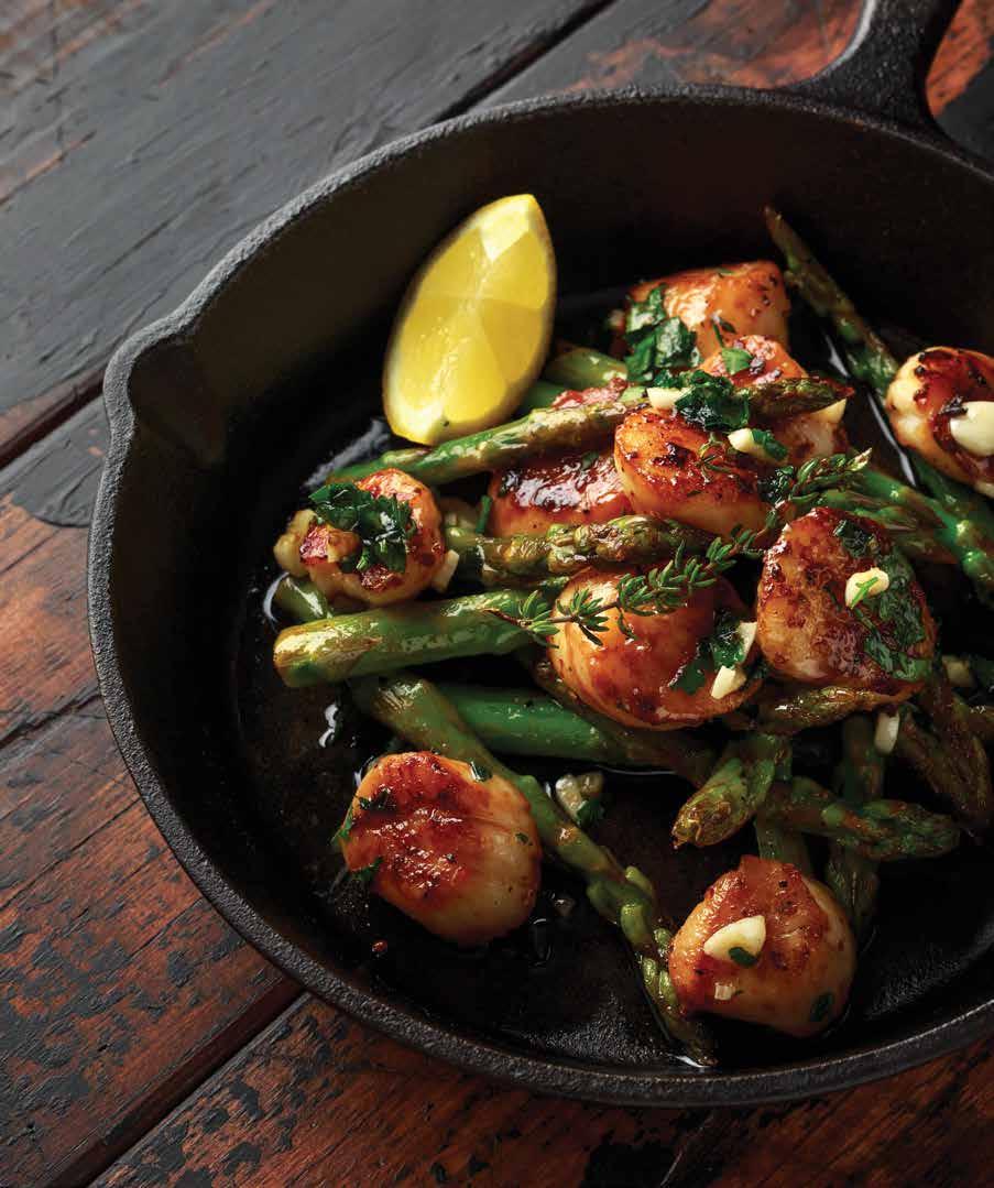 9. Arrange the asparagus on a serving platter, top with the seared scallops, and drizzle the garlic and parsley butter sauce over the top. Garnish with lemon wedges and extra chopped parsley if desired.