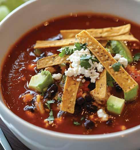 4. Ladle hot soup into bowls. Top with crispy tortilla strips, diced avocado, crumbled cheese, chopped cilantro, and a squeeze of lime.