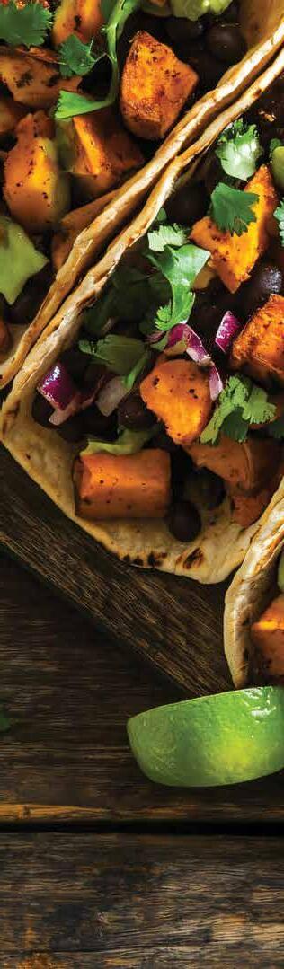 4. Warm tortillas on a dry skillet or over a gas flame until lightly charred. Spoon sweet potato–black bean mixture into each tortilla. Top with crumbled Cotija, fresh cilantro, and any optional toppings you like.
