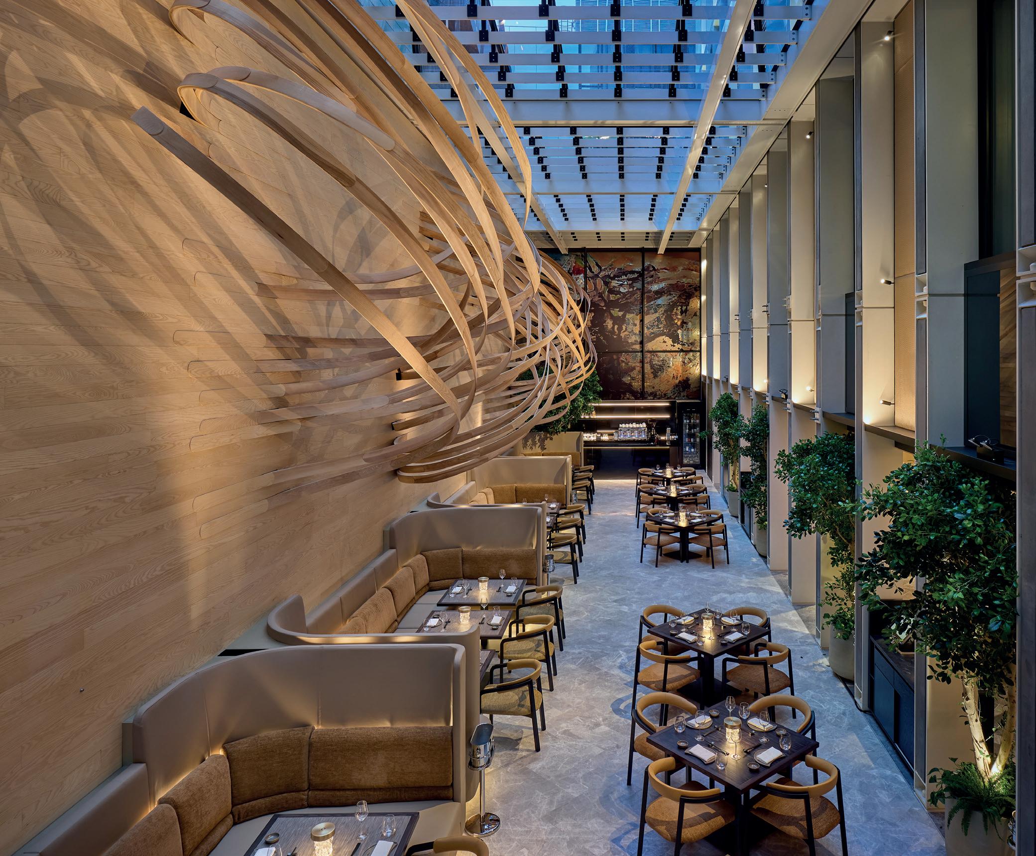 The new Mayfair destination doesn't disappoint, with an elegant dining room designed with the elements of earth, wind and water in mind. The warm and inviting space is completed with a triple height sky roof, verdant greenery, and dramatic marble, circular staircase.