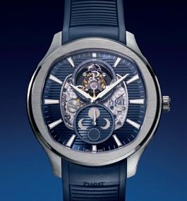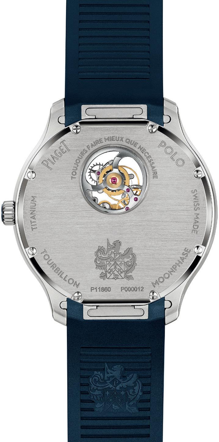 calibre that drives it, the 642P, which itself is just 4 mm thick. Extravagantly defying expectations, the Piaget Polo Flying Tourbillon Moonphase displays a 44 mm-diameter titanium case alternating polished and satin-brushed surfaces. Light, yet extremely strong, this material has earned its place among the noblest of alloys, not for its rarity but for its exceptional performance. This includes its ability to retain all its properties when it is coloured using the PVD technique. This latest creation presents blue case flanks and a blue crown insert, matching the dial with their shade and their gadroons, a visual signature that has set the tempo for the Piaget Polo collection since its inception in 1979.