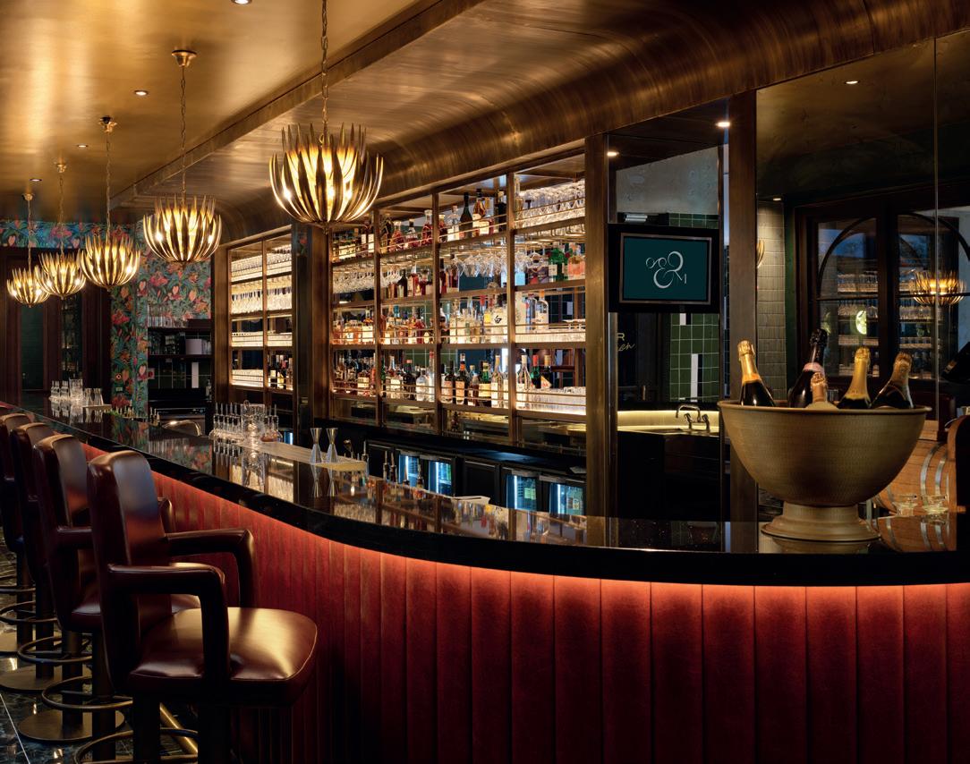The gently rippled chandelier, inspired by the ethereal textures of the sky, anchors the ceiling, enhancing the bar's airy, dynamic atmosphere, harnessing the feeling that anything can happen.