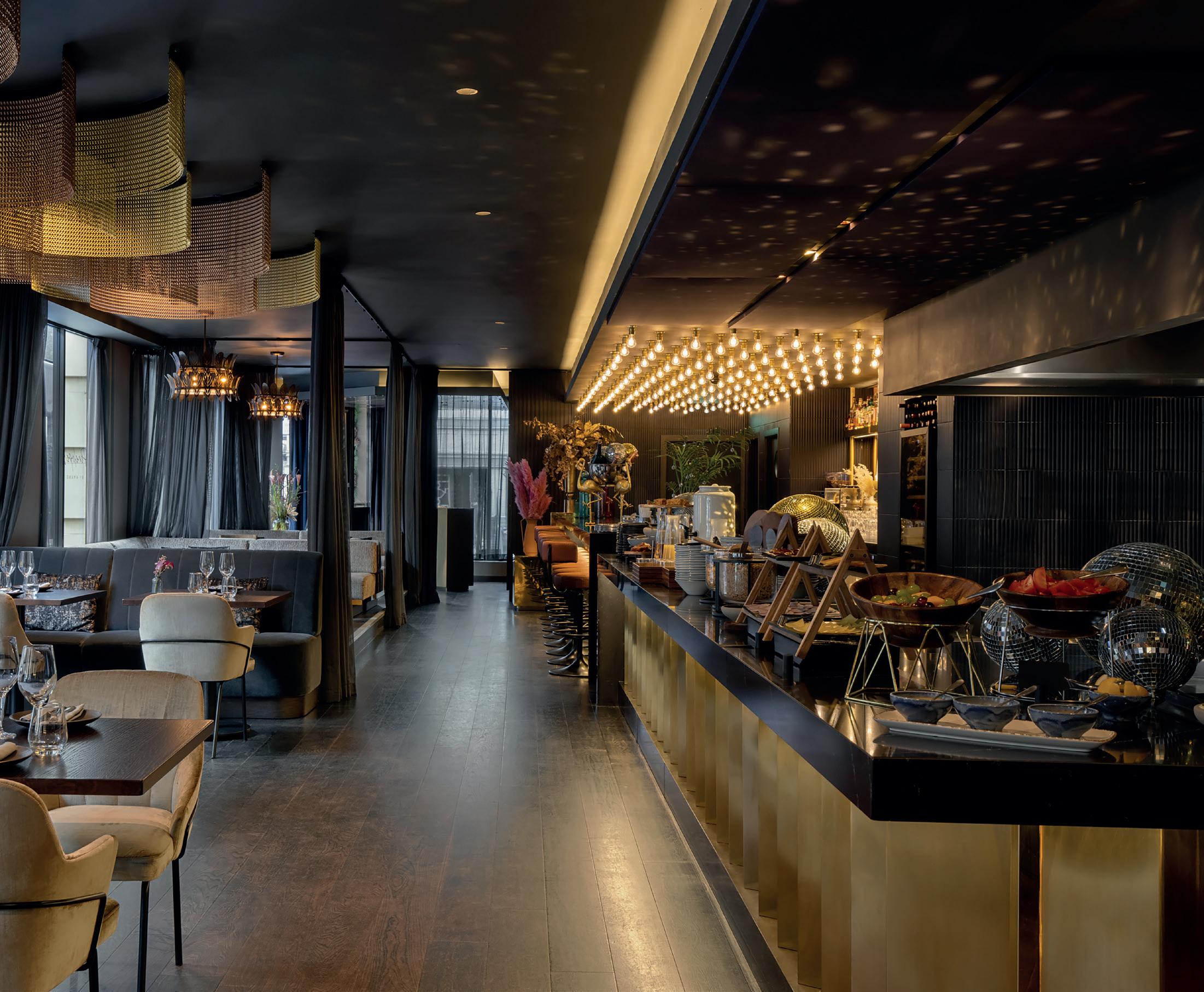 Located within an imposing 310-year-old building (formerly the London College of Music) in the heart of Soho, Sucre’s interiors are pure glamour. Designed by notable Japanese architect Norivoshi Muramatsu, the space combines soaring ceilings, mirrored walls and spectacular chandeliers made from over 1,000 cut glass decanters. Additional theatre comes from the chefs and open grill, adding to the glittering surroundings.