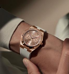 Encircling the dial of the pink gold model, a minutes track is marked in blue - a subtle punctuation in the chic tone-on-tone aesthetic of the case, bracelet, sunburst satin-finished dial and matching pink gold moon-phase display. For a more casual and sporty allure, a textured rubber strap in blue or white can be interchanged with the gold bracelet.