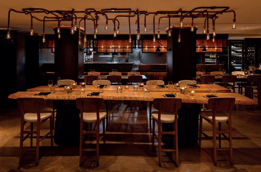 Featuring natural wood and stone, the décor includes maritime touches which have created an inviting coastal atmosphere while the open kitchen adds a lively, interactive element. Comfortable seating makes guests feel at home and soft lighting further enhances the dining experience. The ambiance here is both relaxed and refined.