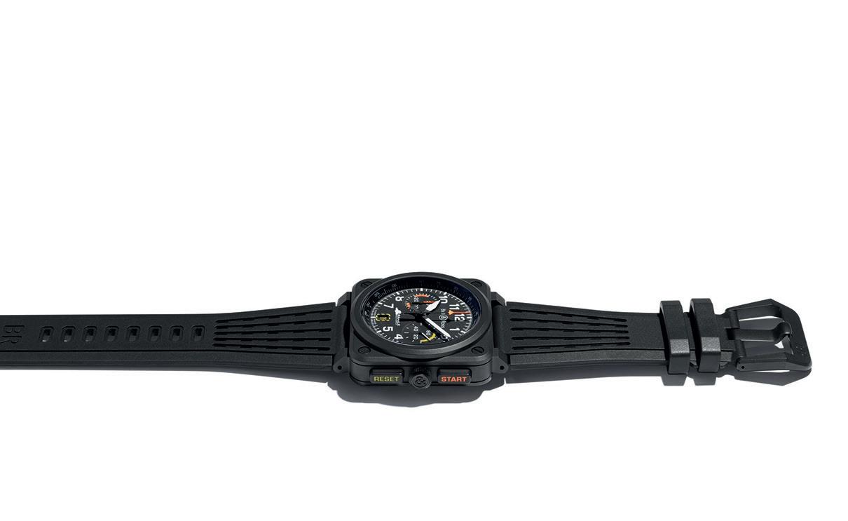 The new BR-03 Rafale Solo Display chronograph has been designed for high performance in extreme conditions. Robust, its case is made of high-tech black ceramic that is resistant to scratches. Precise, the chronograph is powered by an automatic movement, the BR-CAL.301 calibre, with a 42-hour power reserve. Readable, the dial features visual elements inspired by the world of fighter jets - such as the yellow dotted line around the date window - and highlights precision-related indicators, especially through the two orange hands for the chronograph function. The indexes and subdials are coated with photoluminescent material for optimal readability in the dark.
