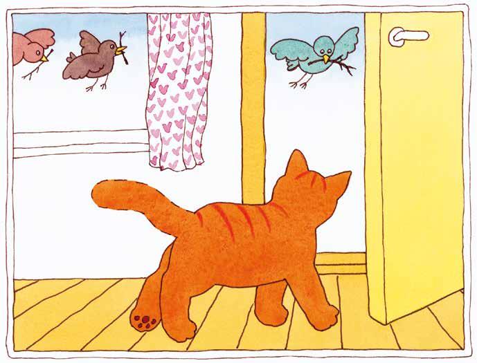 Dikkie Dik wil gaan kijken in de boom. ‘Wegwezen, poes!’ kwetteren de vogels boos. ‘Wegwezen, of we pikken je op je kop!’ Dikkie Dik gaat gauw naar huis.