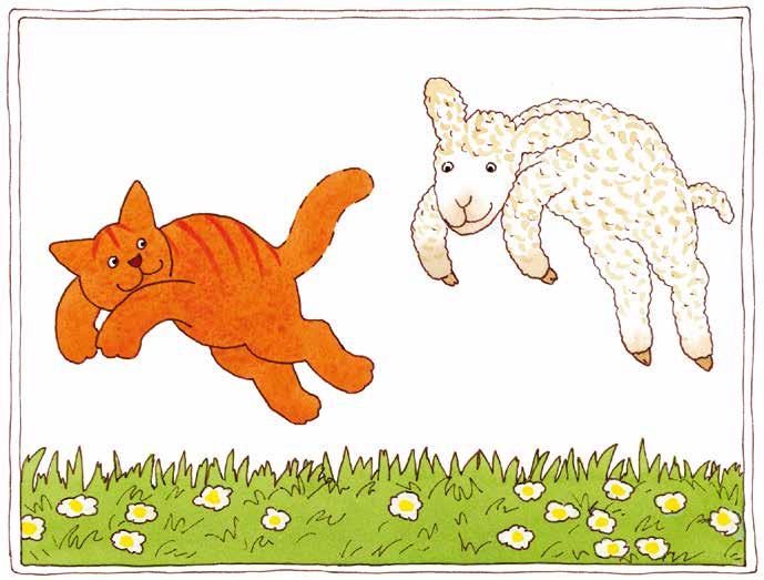 ‘Mèh-hèh-hèh. Dag dikke poes! Doe je mee met springen in het gras?’ roept het lammetje. Bonk, bonk, bonk. Dikkie Dik doet het lammetje na. Hij springt bijna net zo hoog als het lammetje.