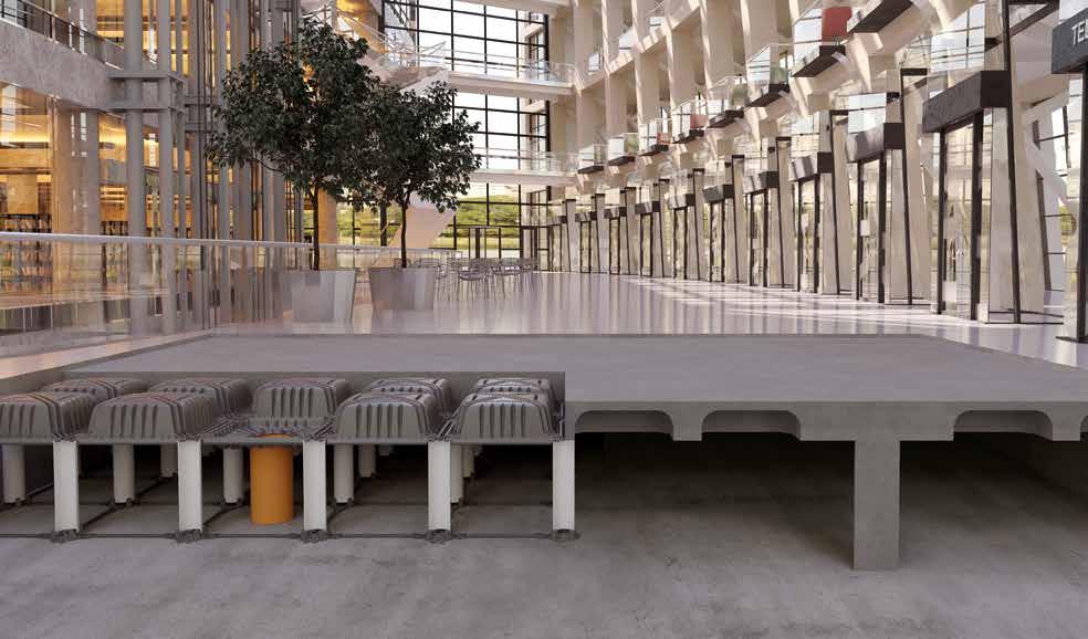 terioteca e un locale stampa, oltre ad aree dedicate ai dipendenti, come la zona break, la cucina e spazi per il relax e la socializzazione. Il pavimento sopraelevato preesistente è stato recuperato per motivi di sostenibilità: offre accesso ai cablaggi e mantiene un’estetica pulita, mentre un avanzato impianto di trattamento dell’aria garantisce ventilazione e controllo della temperatura.