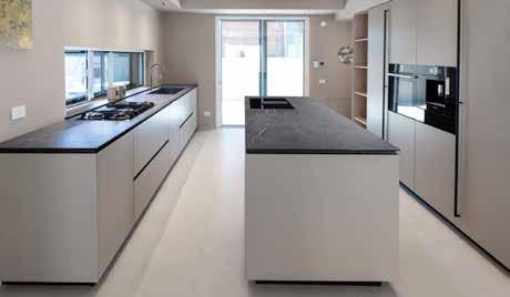 Onirika Neural, caratterizzate da sottili venature scure su fondo bianco, nel primo; Pietra Kode Sabbia, che ricodificano fedelmente il colore e la texture del travertino, nel secondo. Il bagno padronale al secondo piano, invece, ha lavabo, rivestimento parete e pavimento in Marmorio. La collezione Pietra Kode Travertine nei colori Sabbia e Marmorio è ripresa anche all’esterno per le mura di cinta, la cucina e il bagno turco.