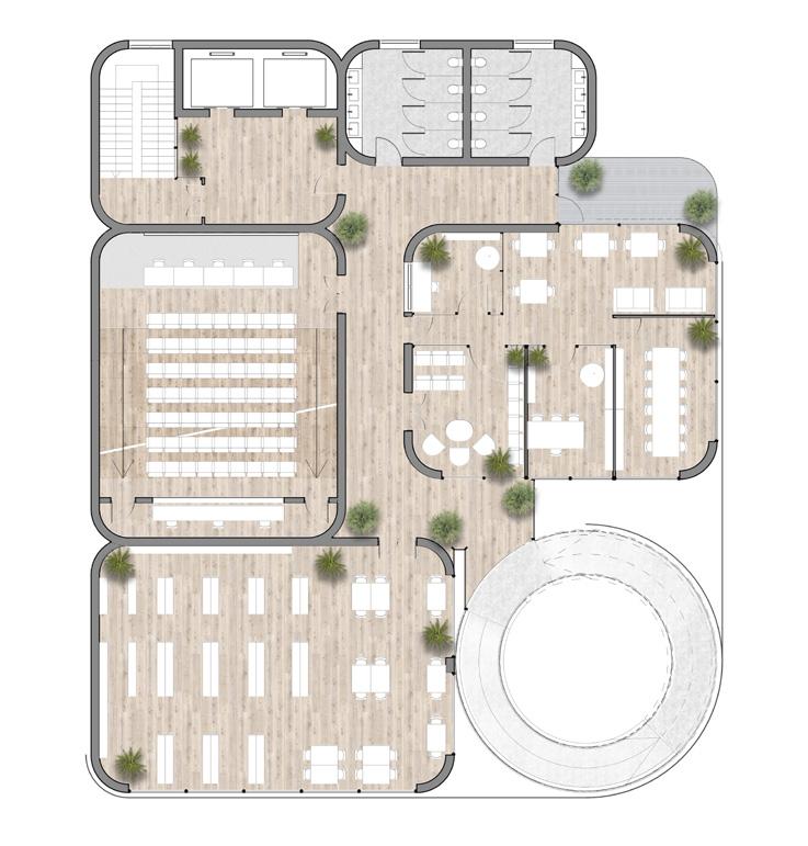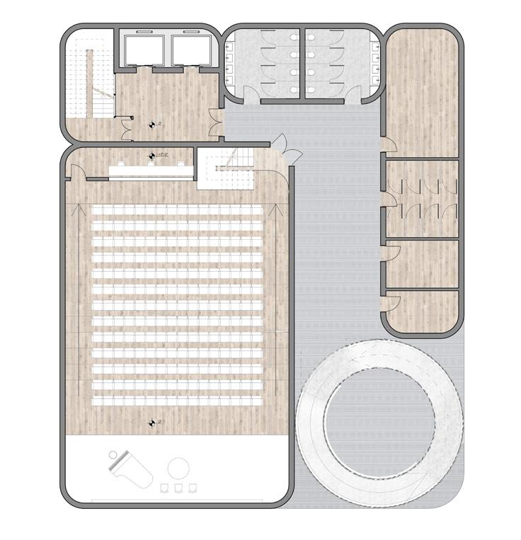 The architecture can be divided into 3 parts : the public, the interaction space, and the private. The public theater is located in the celler for everyone who purchases the ticket from the ticketing on the ground floor. The main hall and exhibition space is also located on the ground floor for public. Also, for the public, the cafe, bar, and bookstore are located on the second floor. On the third floor, there is the outdoor gathering space where the public and the students can interact with each other. From the fourth floor, there are music rooms, rehersal rooms, library, auditorium, and administration for the students of the dance academy.