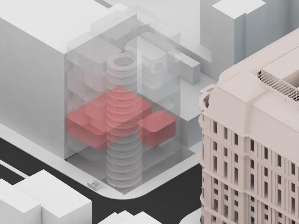 Instead of applying the back on the ground floor, the setback is located on the 7th floor to open up the outdoor space for the students in order to engage with the view of the city and the school. The important factor to consider was the corner condition of the building where the outdoor balconies are designed for the visual connection with the school.