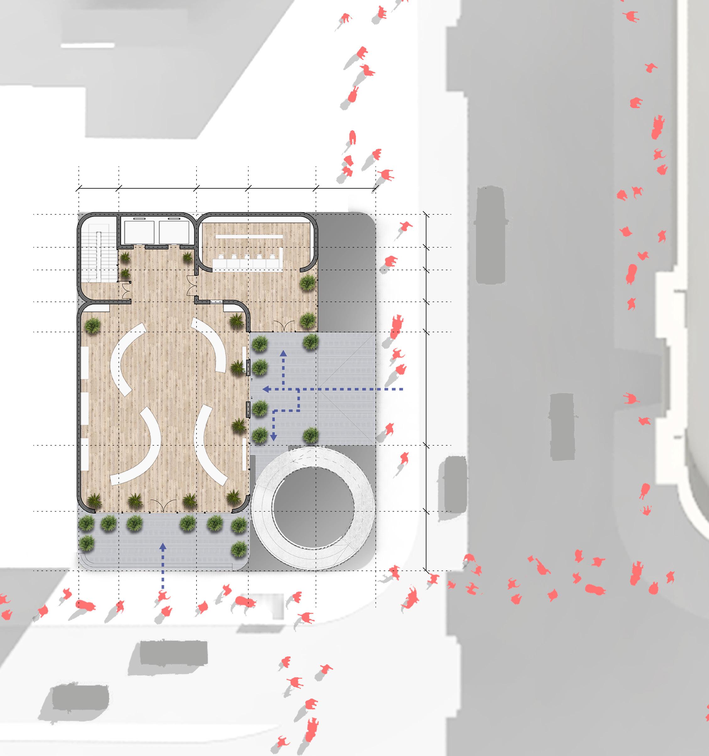 There are numerous accidents every year involing pedestrians and bicycle riders. The first step of the design process was to split circulations of the two for a safer and systemetic circulation.
