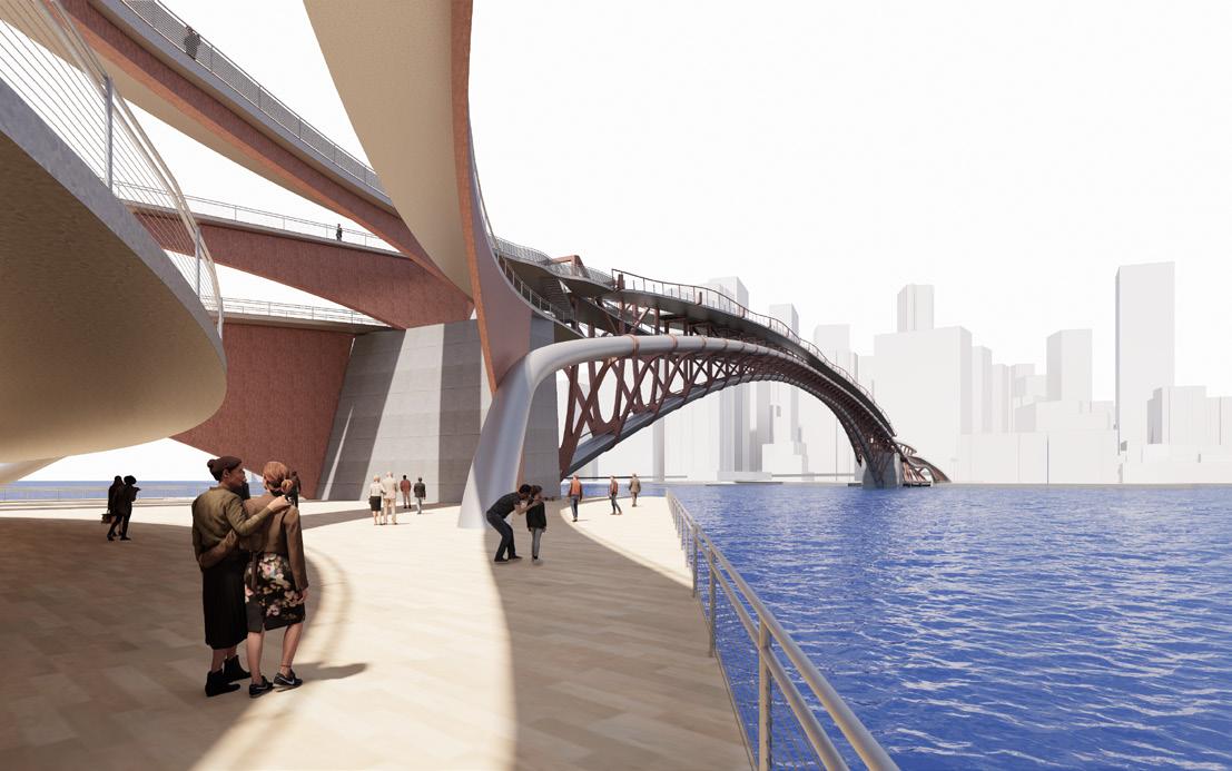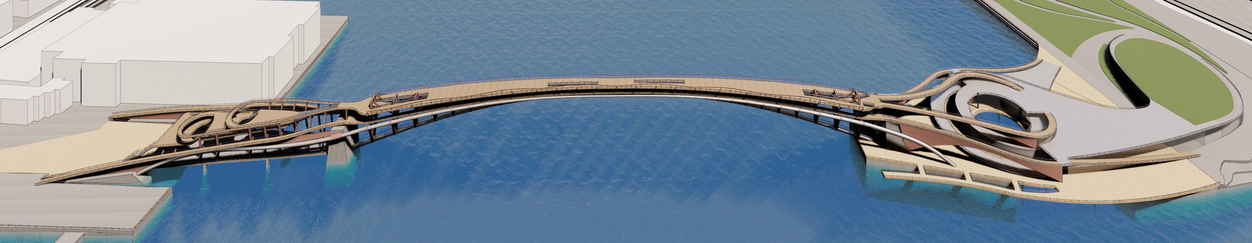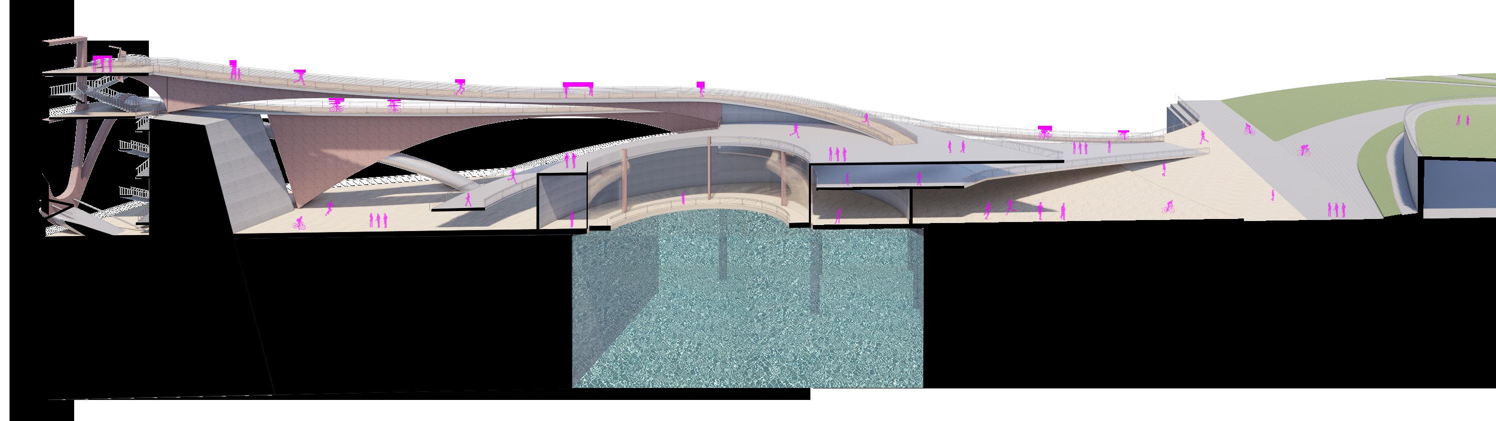 The piers of each side of the bridge are consists of the public spaces where people can perform and gather around. From where the paths starts, it is all for the circulations of the people without any disturbance. There are two ramps in the center of the bridge that connects the two decks together. The bicycle riders can move up to the top deck to walk and the pedestrians with the bicycles can also go down to the bottom deck.