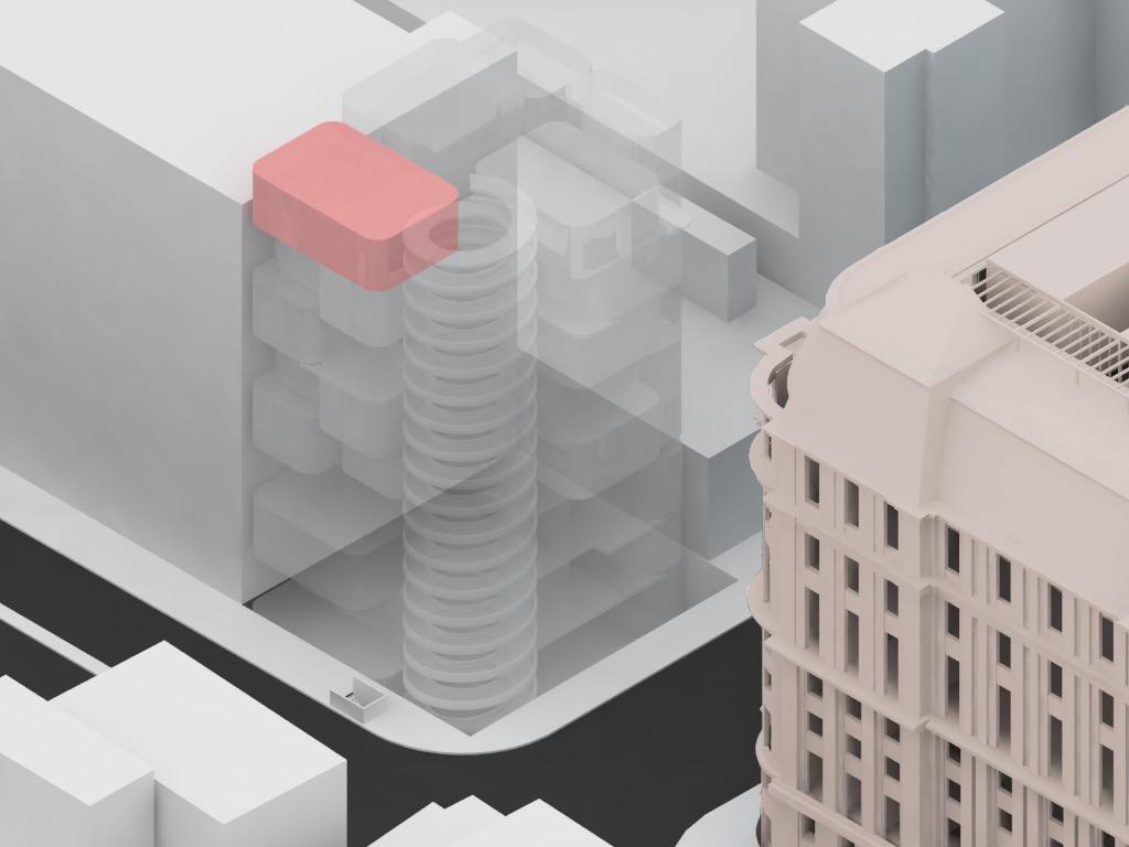 The spiral ramp is the starting point of each circulation of the floor. it creates the continuity of the building and acts as the important piece that locks each floors together. Even though the architectural programs are divided into the hierarchy system, the spiral ramp connects all the floors together.