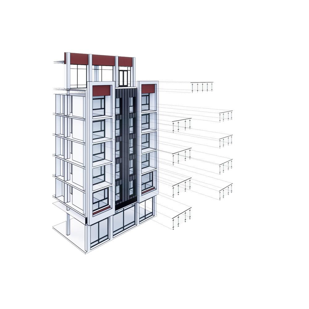 1 MAXIMUM MASSING: SETBACK AT 65'-0" SCALE: 1/64" 1'-0" 4 HEIGHT AND SETBACK DIAGRAM MYRTLE AVE SCALE: 1/16" = 1'-0" 2 LOT COVERAGE SCALE: 1/16" = 1'-0" GROUND FLOOR 2ND FLOOR 3RD FLOOR 4TH FLOOR 5TH FLOOR 6TH FLOOR 7TH FLOOR GROUND FLOOR 2ND FLOOR 3RD FLOOR 4TH FLOOR 5TH FLOOR 6TH FLOOR 7TH FLOOR CELLAR CELLAR 13'-9 1 2 14'-8" 9'-8" 9'-8" 9'-8" 9'-8" 11'-8" 12'-8" 55' 23'-6" 19'-11 61'-11 2 100' PART B PART C PART D PART A = 55' X 51'-6 = 2,833 SQ. FT PART B = 48'-1 X 19'-11 = 960 SQ. FT PART C = 61'-1 X 23'-6" = 1,434 SQ. FT PART D = 150' X 55' = 8,250 SQ. FT TOTAL COMBINED LOT COVERAGE 13,477 SQ. FT 3'-6" HIGH GUARD RAIL SPRINKLERS 12" SMOKE BAFFLE A-002 ZONING MAXIMUM MASSING DIAGRAMS; LOT COVERAGE 4 HEIGHT AND SETBACK DIAGRAM - MYRTLE AVE SCALE: 1/16" = 1'-0" 2 LOT COVERAGE SCALE: 1/16" = 1'-0" 5 HEIGHT AND SETBACK DIAGRAM - GRAND AVE SCALE: 1/16" = 1'-0" 3 DESIGN FIRE DIAGRAM SCALE: 1/16" = 1'-0" SCALE: SITE PLAN DRAWING TITLE: DRAWING NO: DATE: MYRTLE AVE GRAND RYERSON STEUBEN ST 12/11/2015 JEFFREY HUANG 09 OF 16 VARIES H J K ZINC CASSETTE CLADDING CEMENT BOARD COVER CONTINUOUS INSULATION 3'-6" GUARD RAIL BALCONY DRAINPIPE 15'-6" 11" 8 1 2 6'-6" 7'-10" 1 TYPICAL 2 BEDROOM UNIT SCALE: 1/4" 1'-0" 4 TYPICAL 3 BEDROOM UNIT SCALE: 1/4" = 1'-0" SITE PLAN PROJECT: RYERSON ANNE GREENE ROBERT SIEGEL PAUL UM STUDENT PRATT MYRTLE AVE BROOKLYN, UNDERGRADUATE OF ARCHITECTURE DESIGN STUDIO DESIGN TEAM: ENGINEERING ROBERT OTANI ERIK VERBOON JEFFREY HUANG 2 TYPICAL 2 BEDROOM SECTIONS SCALE: 1/4" 1'-0" 3 TYPICAL 2 BEDROOM SECTION SCALE: 1/4" 1'-0" H J K 8' 8" 8" 15'-6" UP 11" 8 1 2 16'-8" 7'-4" 3' 6'-6" 7'-10" A-402 TYPICAL UNITS DETAILS 7 TYPICAL 1 BEDROOM UNIT SCALE: 1/4" = 1'-0" 5 TYPICAL SINGLE BED DORM (UNIT J) SCALE: 1/4" 1'-0" 6 TYPICAL TWO BED DORM (UNIT K) SCALE: 1/4" = 1'-0" SCALE: SITE PLAN PROJECT: DRAWING TITLE: DRAWING NO: DATE: ANNE GREENE ROBERT SIEGEL PAUL UM STUDENT PRATT MYRTLE AVE BROOKLYN, UNDERGRADUATE OF ARCHITECTURE DESIGN STUDIO DESIGN TEAM: ENGINEERING ROBERT OTANI ERIK VERBOON JEFFREY HUANG 2 TYPICAL 2 BEDROOM SECTIONS SCALE: 1/4" = 1'-0" 8 EGRESS STAIR SCALE: 1/4" = 1'-0" 9 ELEVATOR SCALE: 1/4" = 1'-0" H ZINC CASSETTE CLADDING CEMENT BOARD COVER CONTINUOUS INSULATION 3'-6" GUARD RAIL BALCONY DRAINPIPE 8 1 2 1 TYPICAL 2 BEDROOM UNIT SCALE: 1/4" = 1'-0" 4 TYPICAL 3 BEDROOM UNIT SCALE: 1/4" = 1'-0" 2 TYPICAL 2 BEDROOM SECTIONS SCALE: 1/4" = 1'-0" 3 TYPICAL 2 BEDROOM SECTION SCALE: 1/4" = 1'-0" Paul Yusung Um p. 53