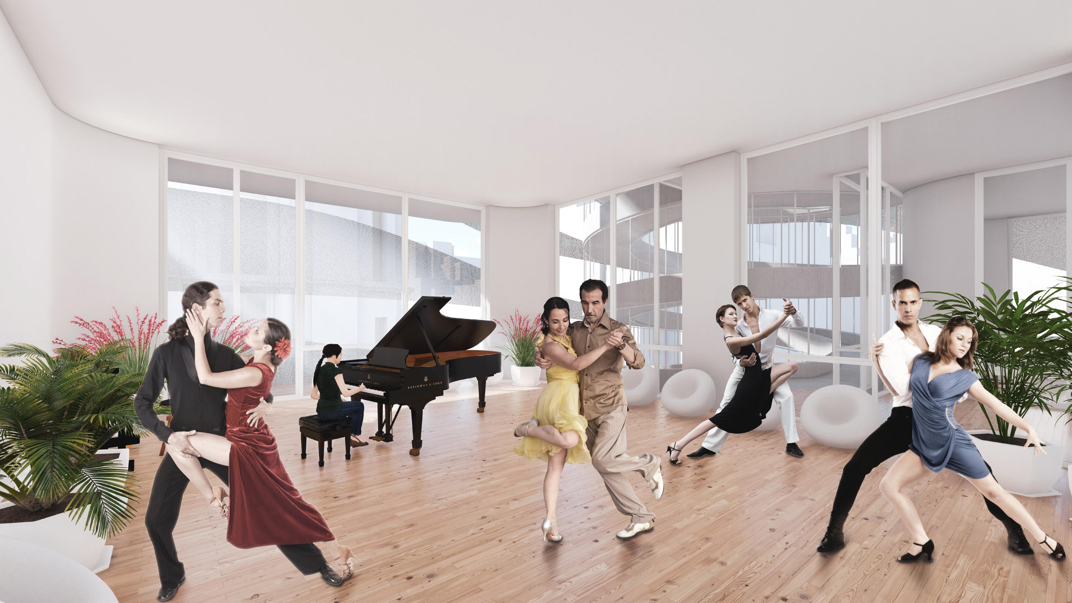 The rehersal room is where the students reherse for the performaces that takes place in the private auditorium on the top floor. The rehersal and music rooms are all private rooms; however, they are connected through the visual connection created by the interior glass walls.