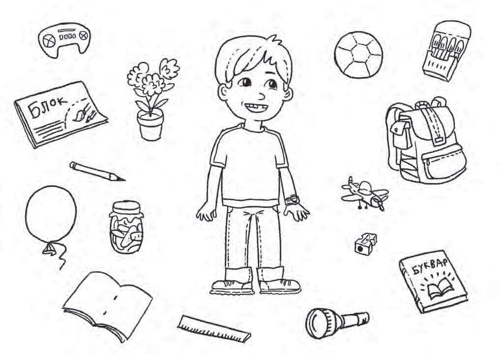 Шта је ђаку прваку потребно за полазак у школу? Пронађи и обој!
