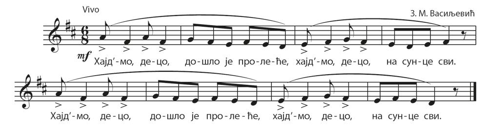 Отпевајте песме „Мали ђачки валцер” и „Хајд’мо, децо” уз тактирање на два потеза, а затим вежбајте ритмичко читање у мери 6 8. на утврђеним позицијама „ре-ми-фа”.