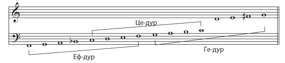 Две суседне лествице имају по један заједнички тетрахорд: доњи тетрахорд Це-дура припада и Еф-дуру, а горњи тетрахорд Це-дура припада и Ге-дуру: