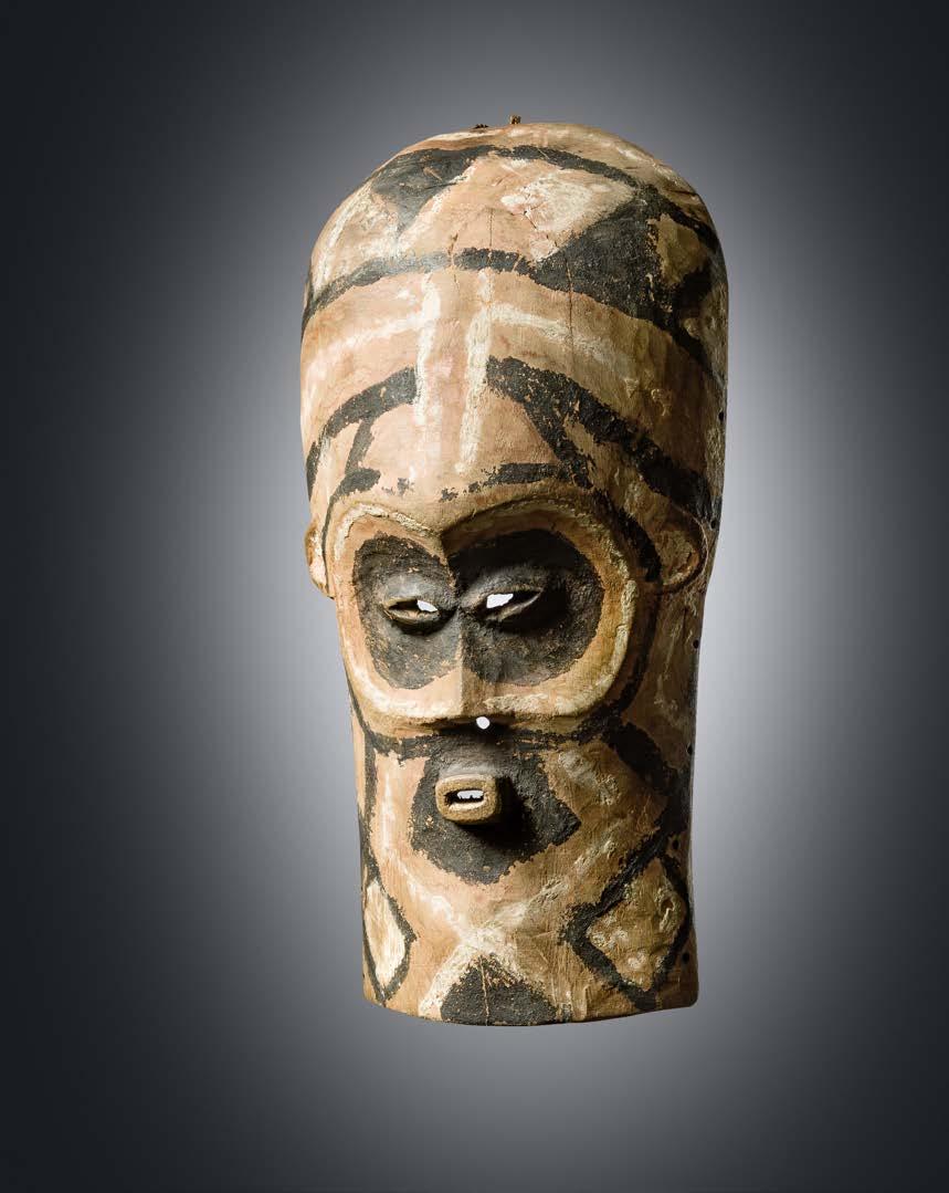 Holz, Pigmente, in roter Farbe beschriftet „1050/7“, Label „3208“, rest. Der Kunsthistorikerin Anita Glaze zufolge, soll ein nahezu identischer Helm aus dem Barbier-Mueller Museum (AHDRC 0130903) aus dem südlichen Gbato-Senufo-Gebiet in der Nähe von Ganaoni stammen. Aufgrund stilistischer Merkmale nimmt sie an, dass es sich dabei um ein Werk des Meisterbildhauers Sabarikwo von Wazomon (Ouazomon) handelt (Art of Côte d‘ Ivoire, Vol II, S. 17). Der erfahrene Afrikareisende und Sammler K.H. Krieg lehnte diese Zuschreibung ab. Laut Informationen vor Ort sei der Typus des BarbierMueller-Helms bei Aufführungen namens „sigi“ („sigui“) von BamanaGemeinschaften im Süden Malis verwendet worden und habe sich von dort auf andere Orte in der Region, möglicherweise auch auf SenufoGemeinschaften entlang der Grenze zwischen Mali und Côte d‘Ivoire ausgebreitet.