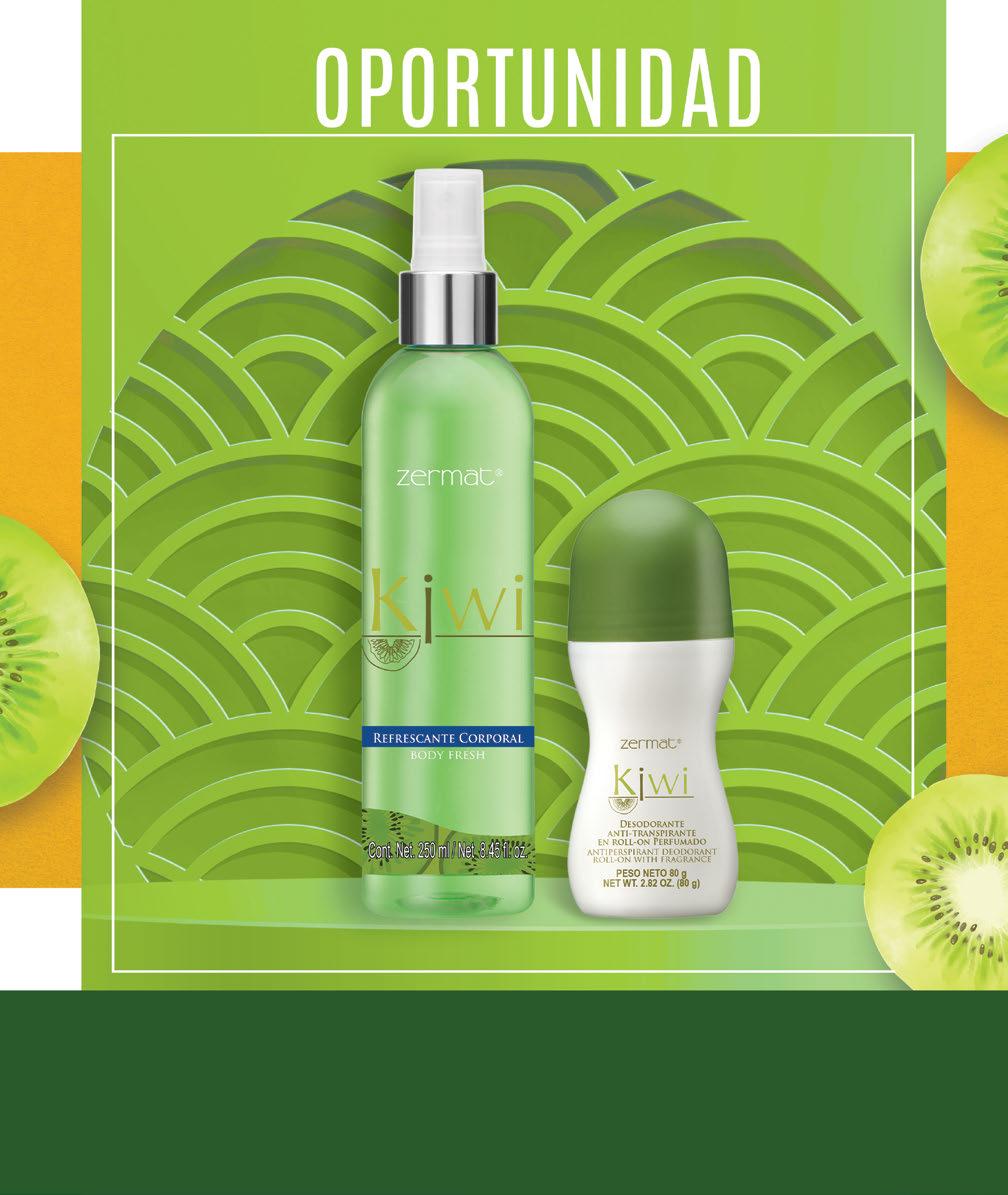 HIGIENE Y SALUD SON BELLEZA Todos los productos Zermat han sido elaborados con ingredientes y materiales de la más alta calidad. Si alguno presenta defectos de fabricación, solicita el cambio de producto o la devolución de tu dinero. PARA USO EXCLUSIVO DE EMPRENDEDORES EN VENTAS Papel certificado que garantiza la reforestación de los árboles que se ocuparon para hacer posible este catálogo. EN ZERMAT NO TESTEAMOS EN ANIMALES ZERMAT INTERNACIONAL S.A. de C.V. Lázaro Cárdenas 47 Col. San Jerónimo Tepetlacalco, Estado de México C.P. 54090 ¡Escríbenos! Correo electrónico: informacion@zermat.com.mx, Ciudad de México y Área Metropolitana: 55 50 89 56 70, Interior de la República: 800 0400 400 USA: 001-7137-84-2103 Emprendedor: @ZermatOficial Síguenos en: PRECIOS DEL CATÁLOGO Código Precio 62545 $20.00 2 Catálogos o más $17.50 c/u Conoce el código de ética de AMVD y WFD5A. KIWI ES PARA TODOS. 85003 Desodorante Anti-transpirante Roll-On Perfumado 80 g $79.90* 90426 Refrescante Corporal 250 ml $199.90* COMPRANDO $600 DE TODO EL CATÁLOGO, LLÉVATE UN PAQUETE KIWI 61977 $99.90* POR MÁS