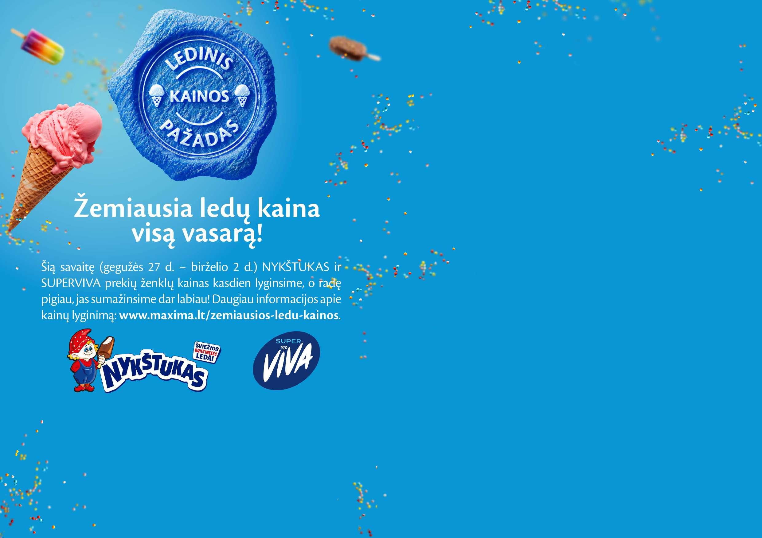 Per savaitę dviejų skirtingų prekių ženklų ledų kainas kasdien lyginsime, o radę pigiau, jas sumažinsime dar labiau! Daugiau informacijos apie kainų lyginimą: www.maxima.lt/zemiausios-ledu-kainos.
