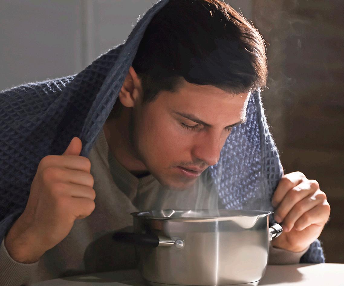 5 Den Kopf darüber (aber bitte nicht hinein!) beugen und mit einem Handtuch ein „Zelt“ über sich und den Kochtopf bilden.