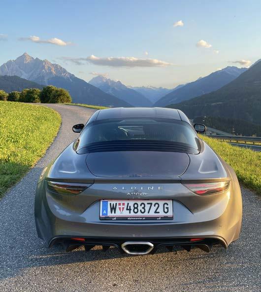 Genau 1.119 Kilo bringt die Alpine A 1 10 GT auf die Waage. Das ist rekord verdächtig wenig für ein modernes Fahrzeug und gleichzeitig einer der wichtigsten Fakto ren für Fahrdynamik und Fahrspaß. Ein weiterer Faktor ist ein kräftiger Motor, der gerne hochdreht und seine Freu de am Auspuffendrohr nach draußen schreit. Dazu reicht in der Alpine ein 1 ,8 Liter Vierzylinder-Turbo, der mit den wenigen Kilos leichtes Spiel hat. In nur 4,2 Sekunden schießt der Zweisitzer auf Tempo 100 und lässt die Flunder bis zu 260 km/h schnell werden.