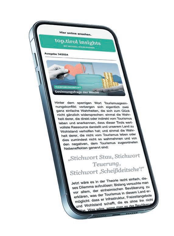 PS: Wenn Sie regelmäßig das Neueste aus der Tiroler Wirtschaft bequem in Ihrem Maileingang finden wollen, empfehlen wir, unseren kostenlosen Wirtschafts-Newsletter top.tirol insights unter www.top.tirol/newsletter zu abonnieren.
