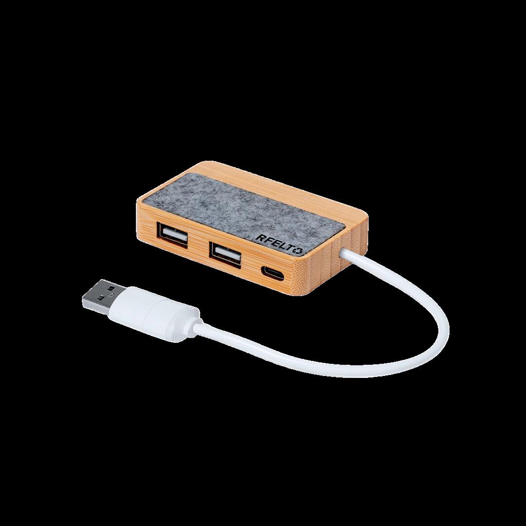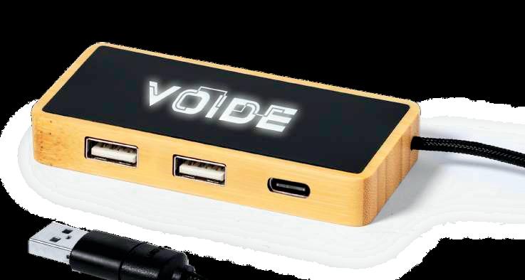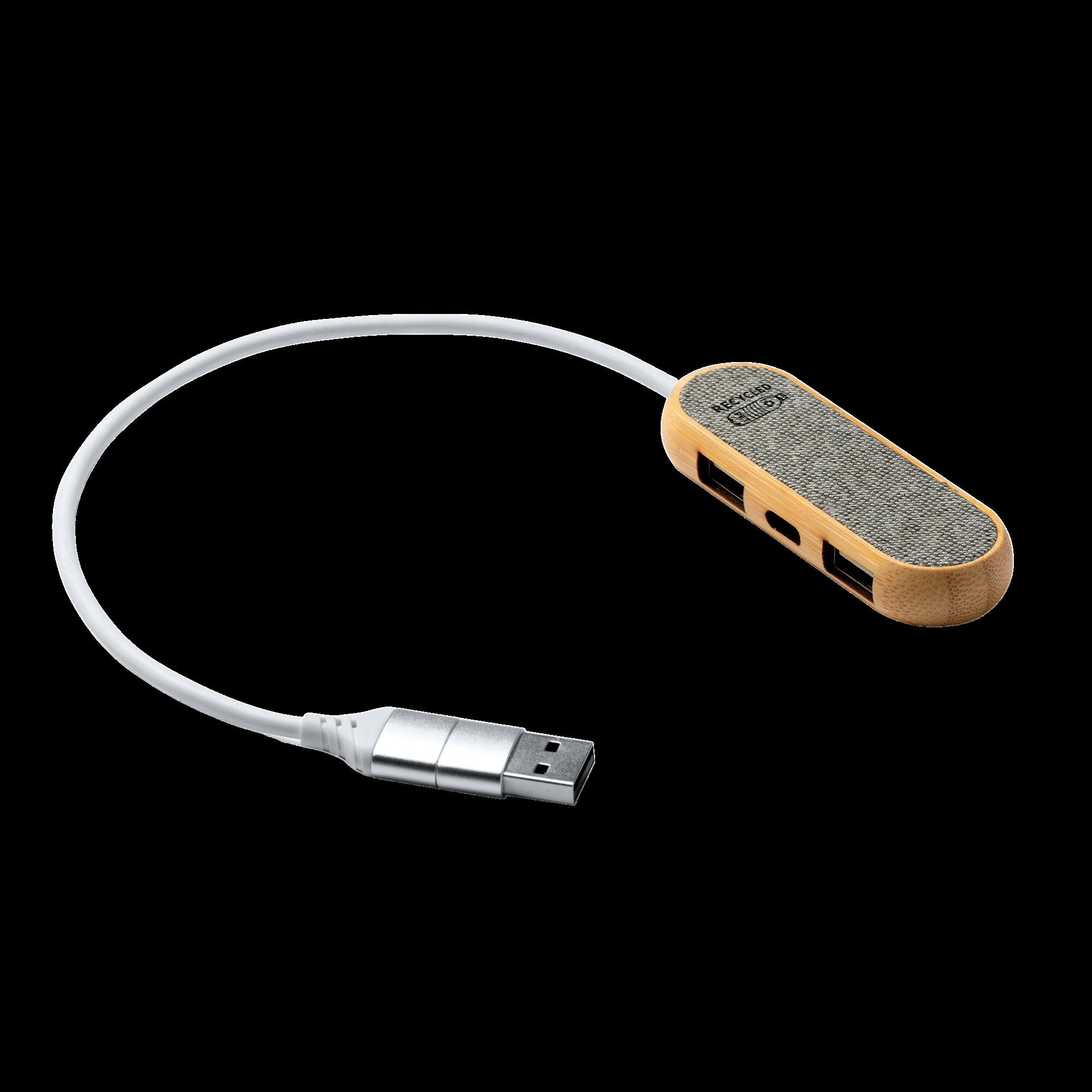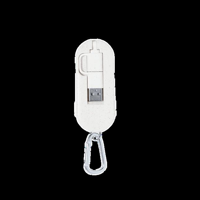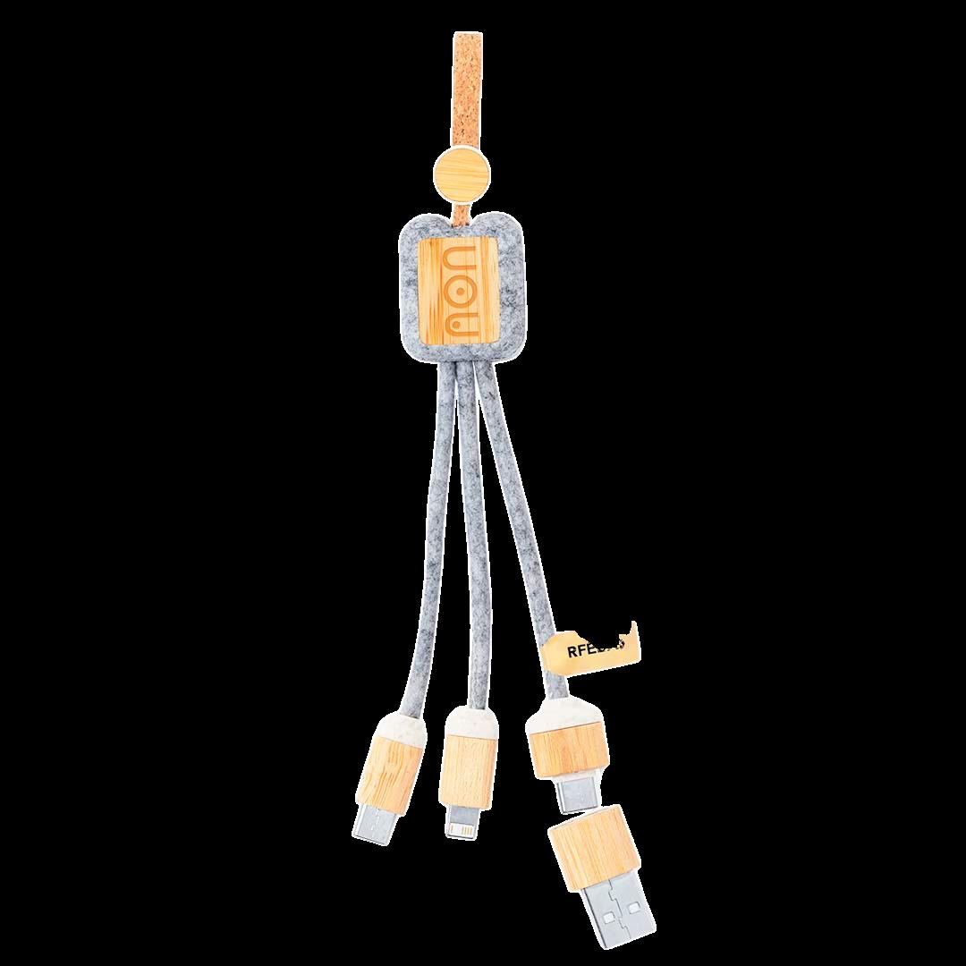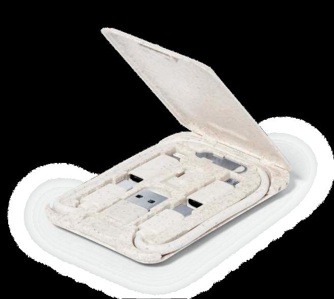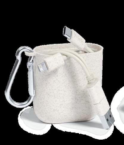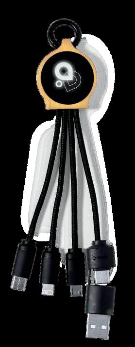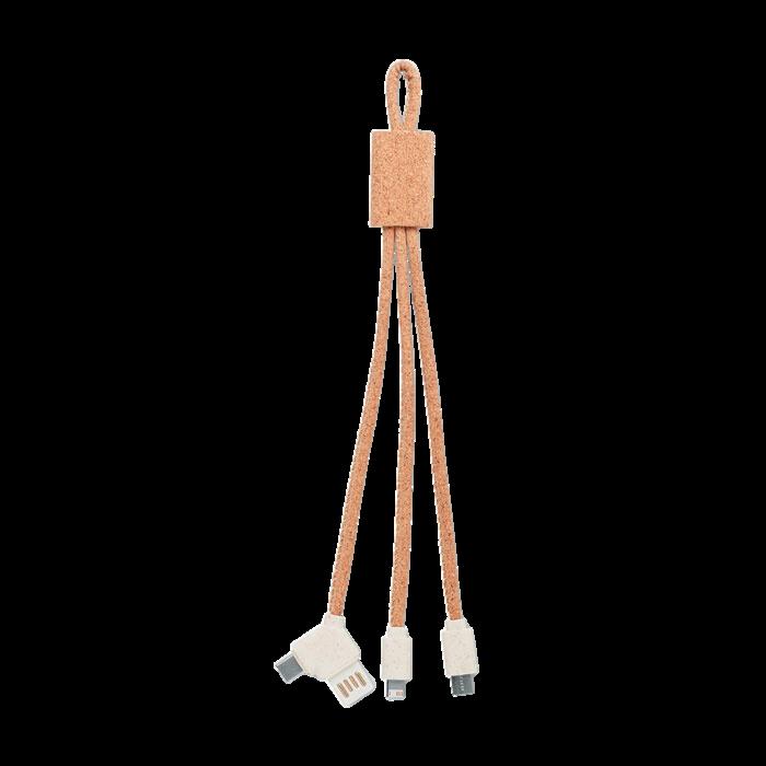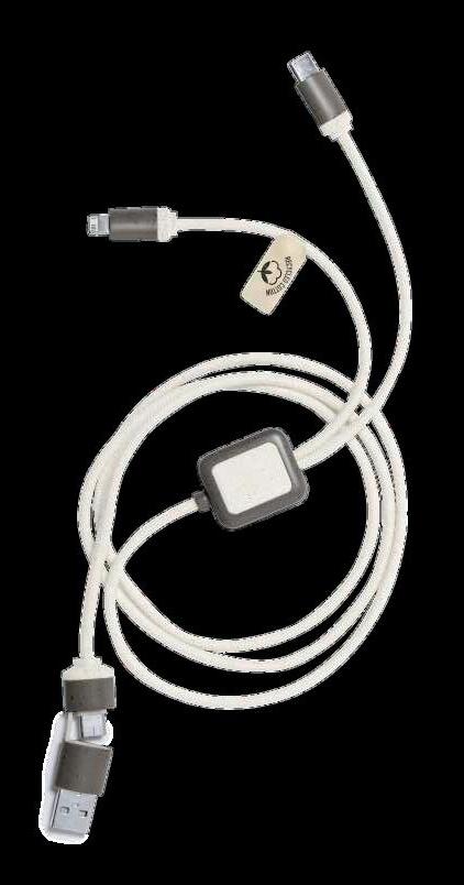Charging cable made of coffee fibre, with cables covered in recycled cotton. Type C and USB input connections, with Type C, Lightning and Micro USB outputs. 5V DC 2.4A