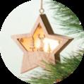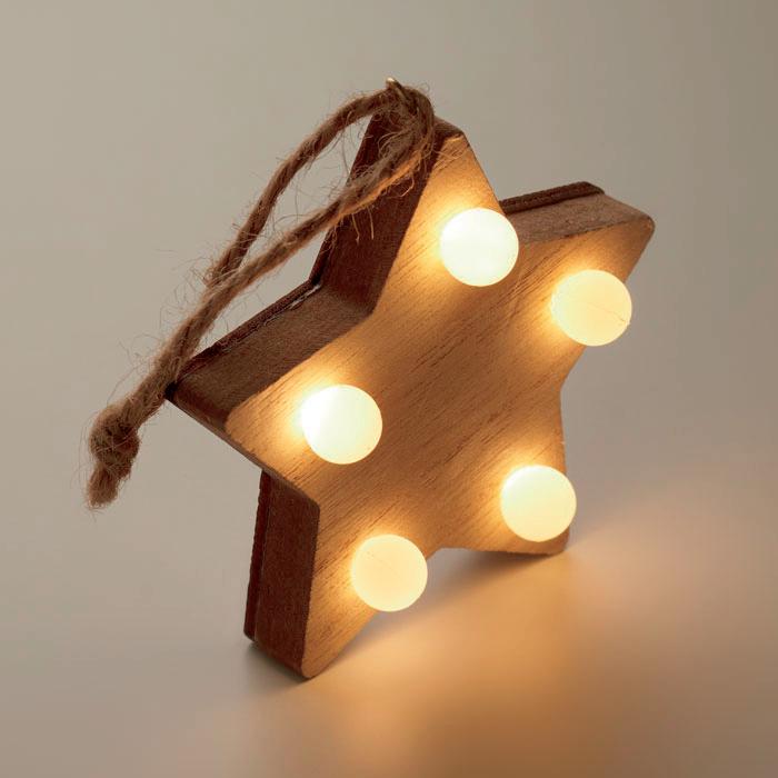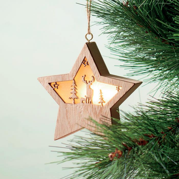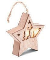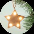 MDF decorated star with light inside with Christmas ornaments and hanging cord.