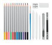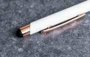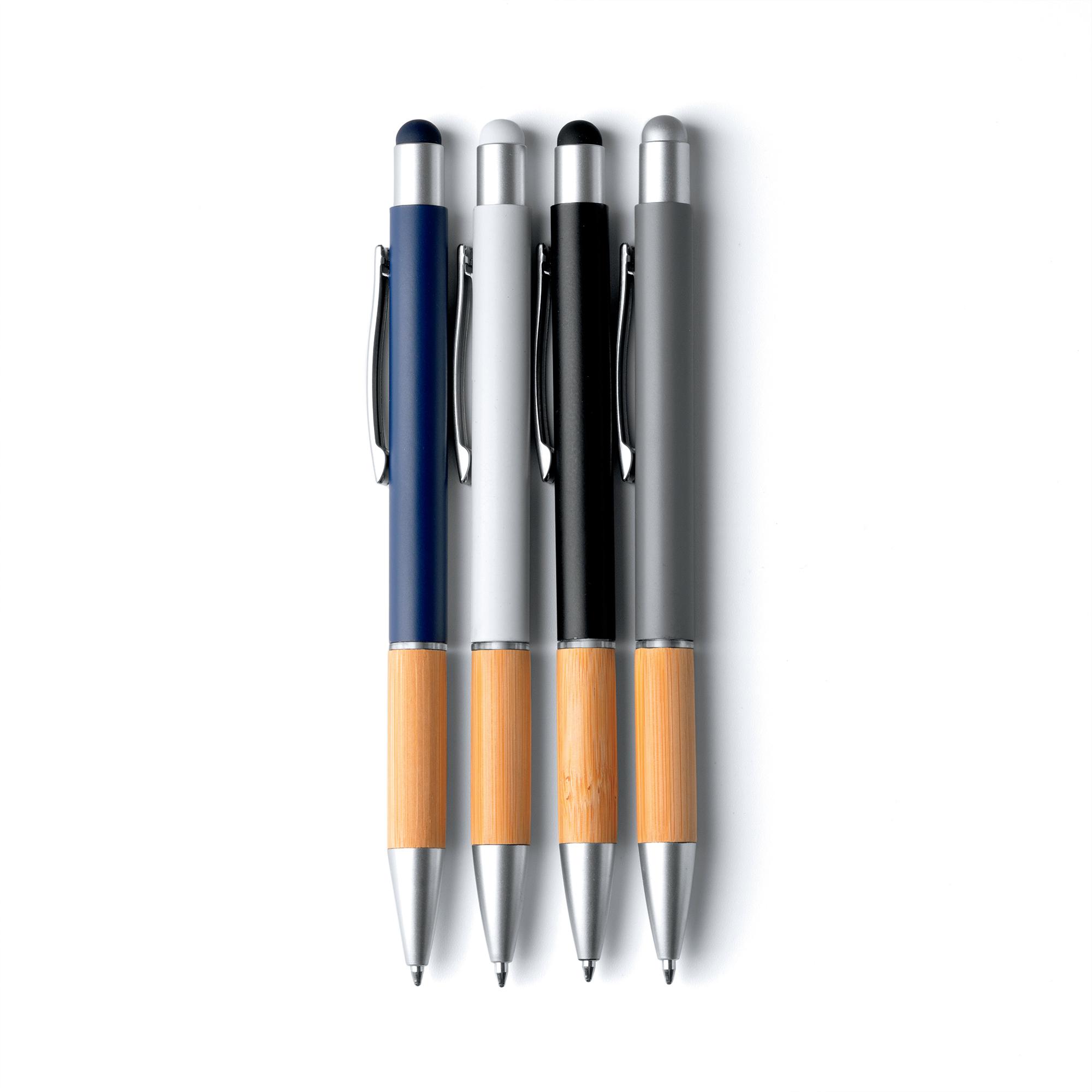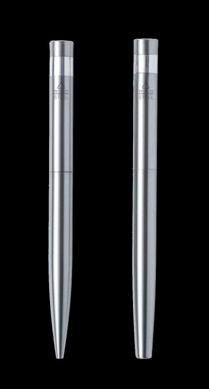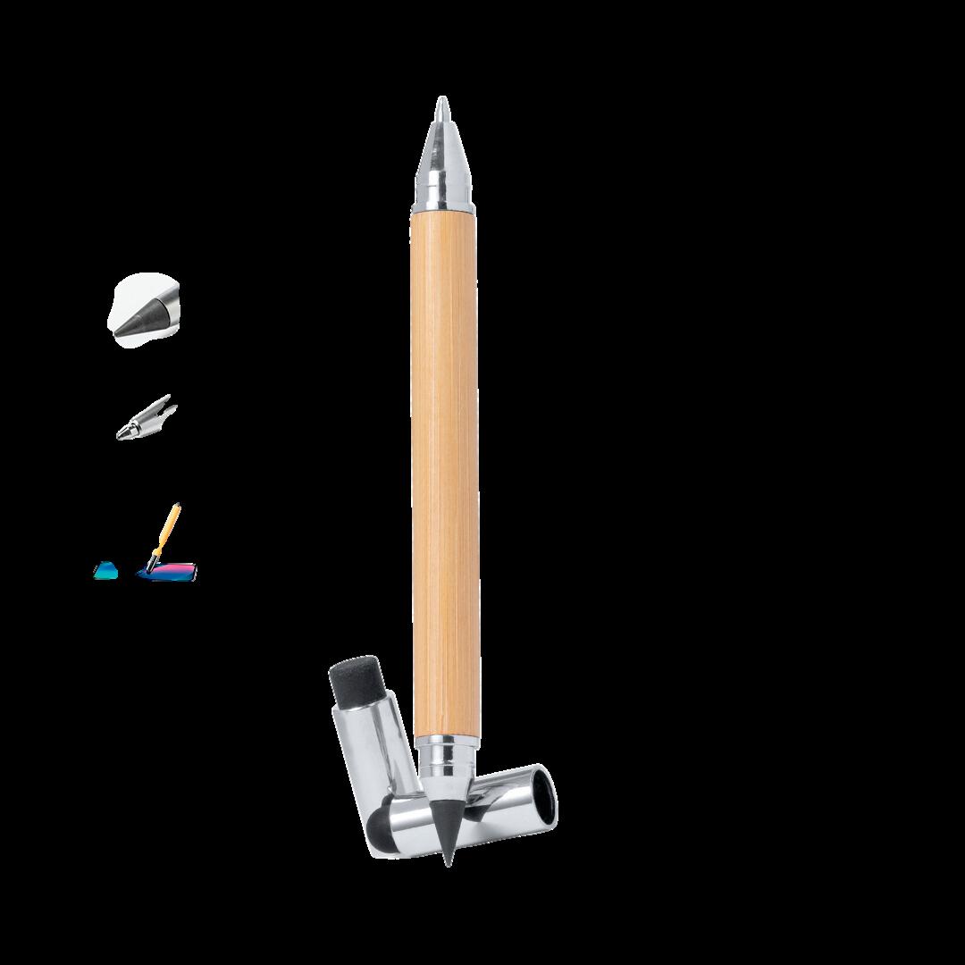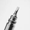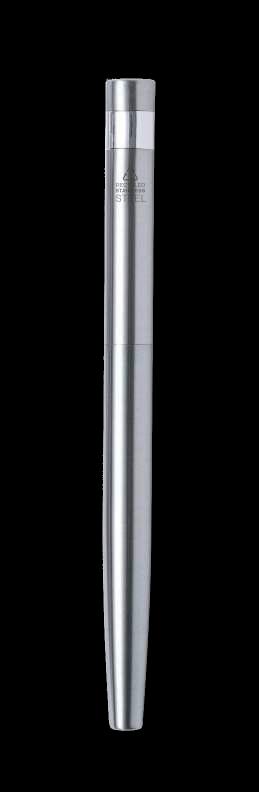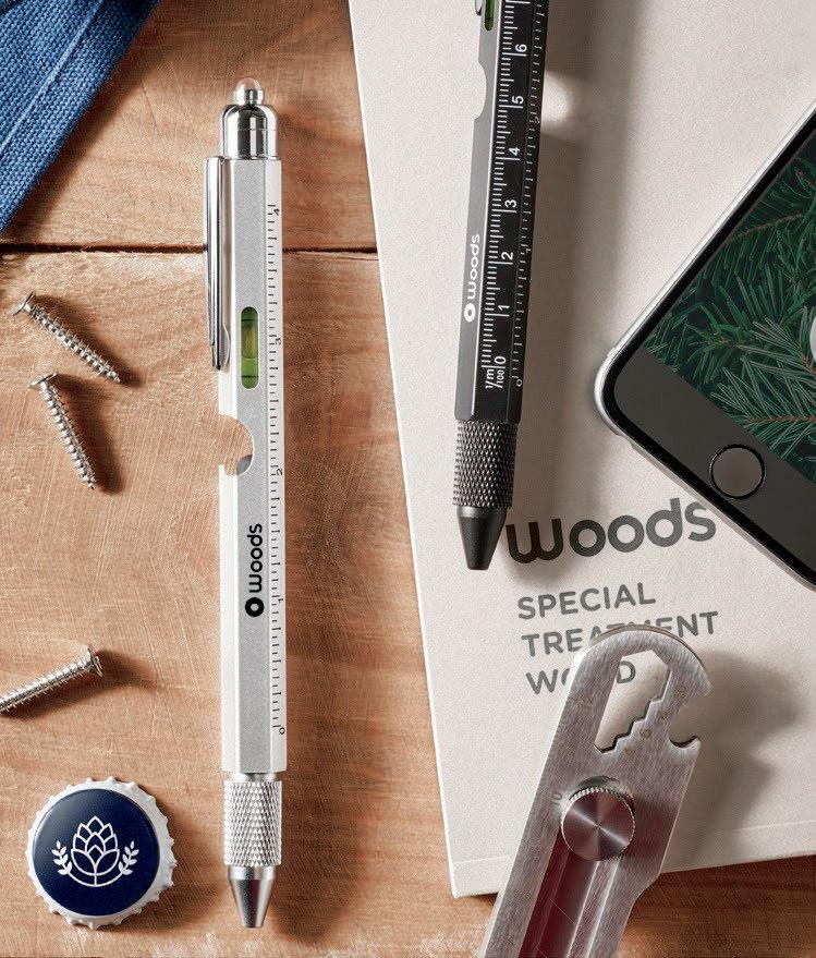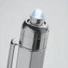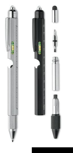Twist action spirit level pen in stainless steel with ruler, stylus and Phillips head and flat head screw driver bits and LED.