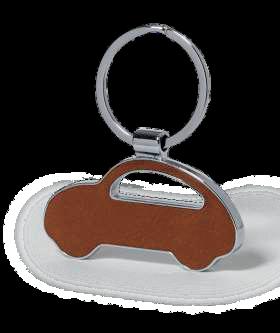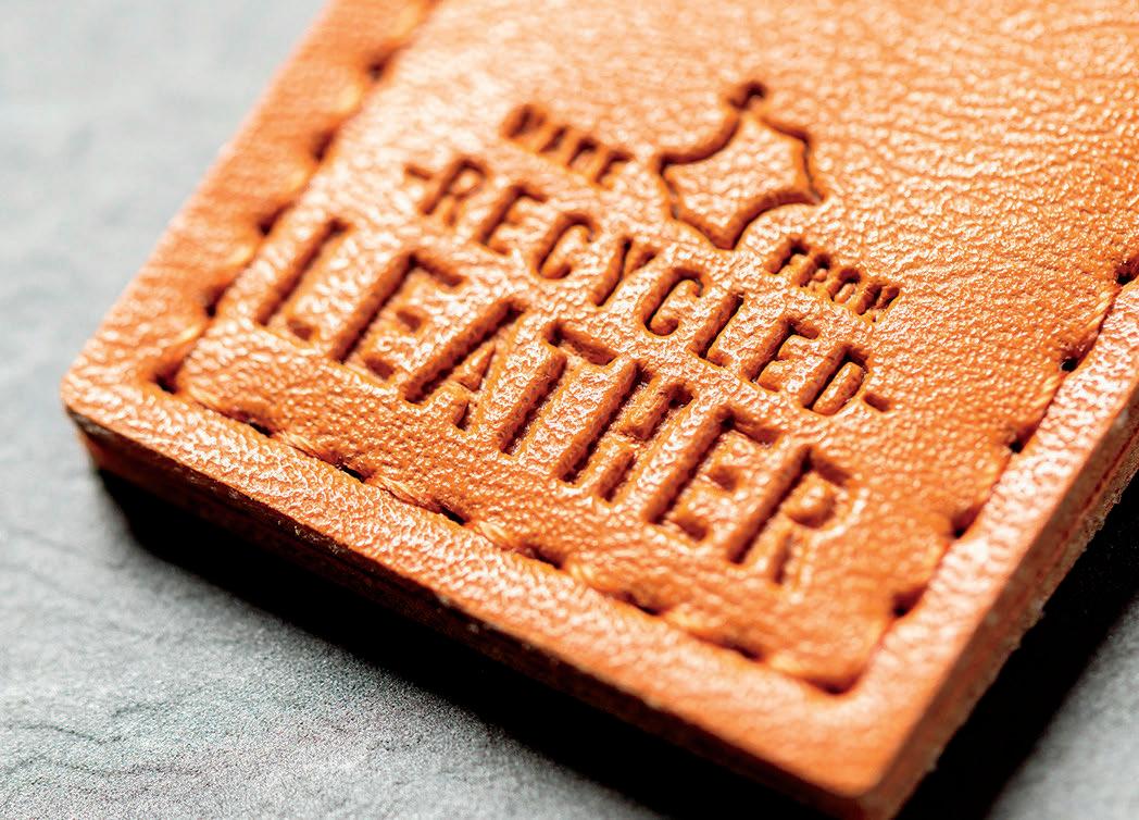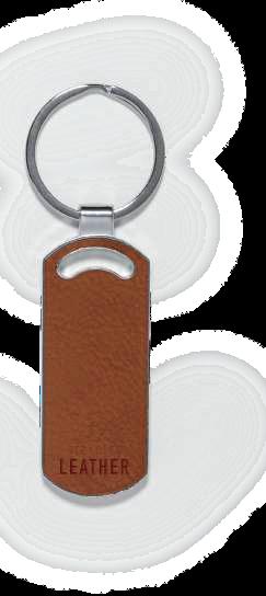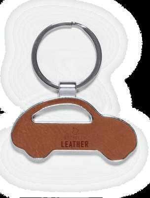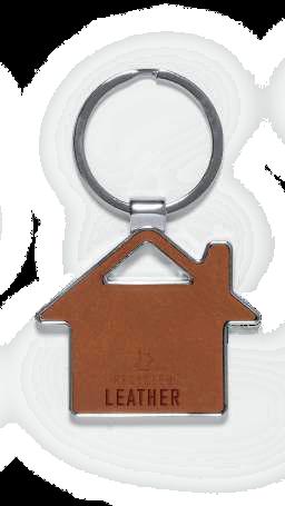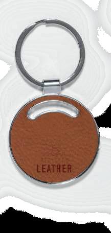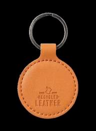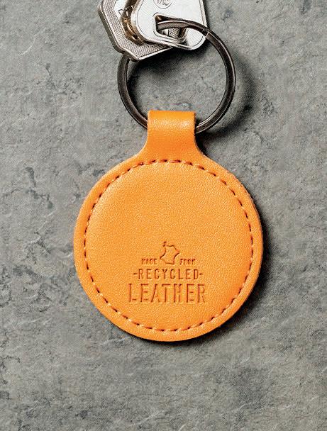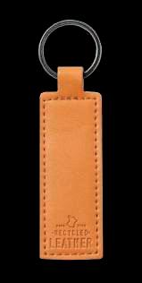 Keyring made of recycled leather. In brown, featuring a recycled leather logo on one side Various shapes