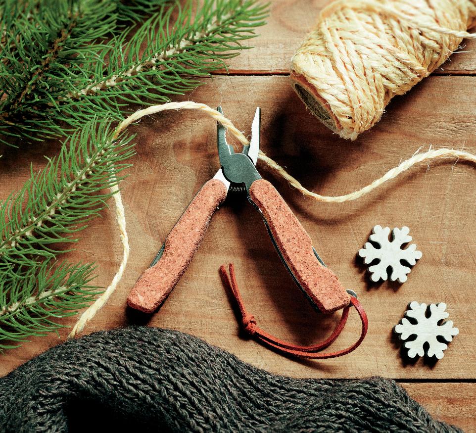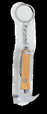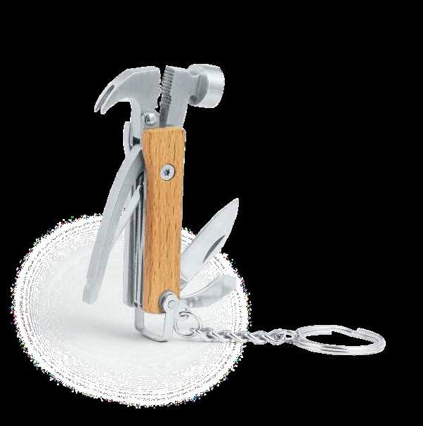 Handy multi-tool key ring made in resistant stainless steel and wood. With 7 functions: hammer, pliers, small flat screwdriver, pliers, knife, wire stripper, file and bottle opener.