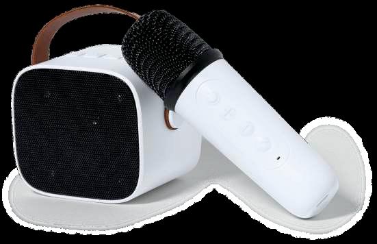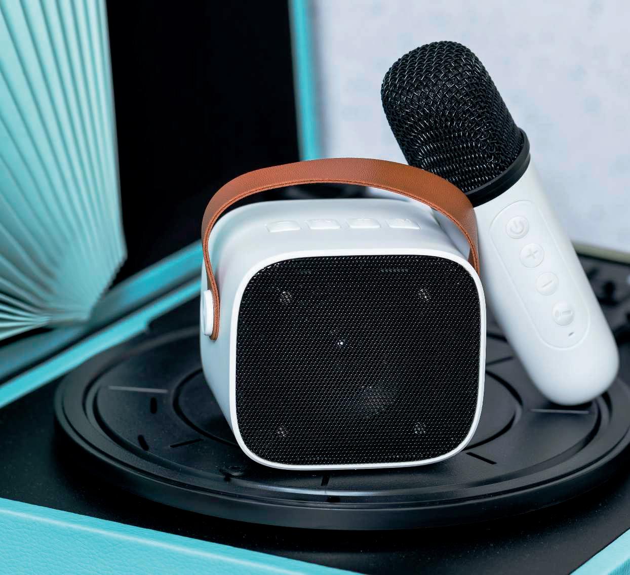 Unique karaoke pack with speaker and microphone. Including: Speaker with useful PU carrying handle. 5W power and 1200 mAh long-lasting battery. Bluetooth Connection.