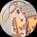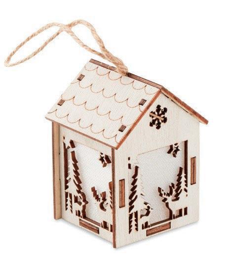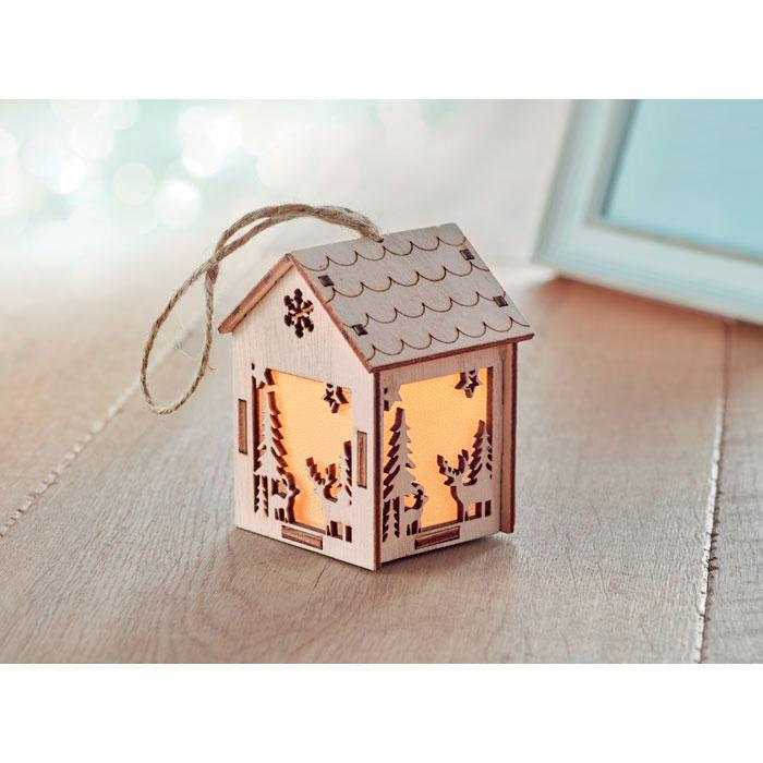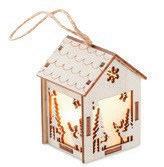 MDF decorated house with light inside with Christmas ornaments and hanging cord. Including 3 AG10 batteries.
