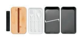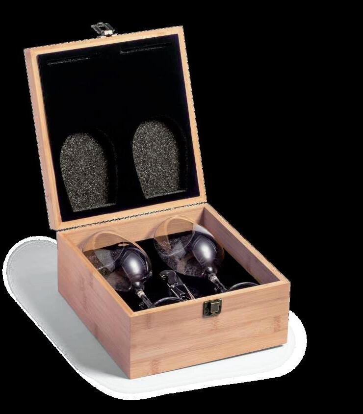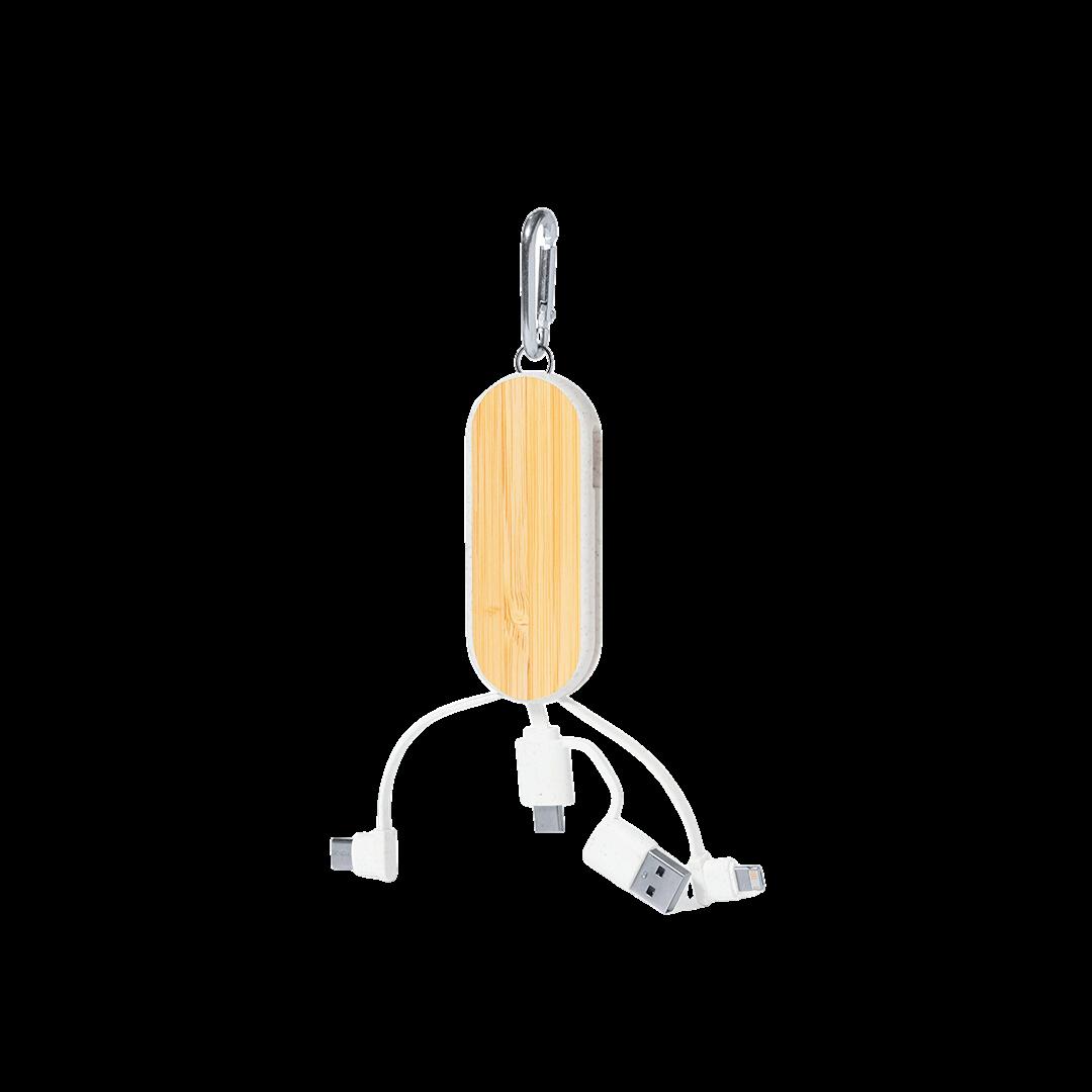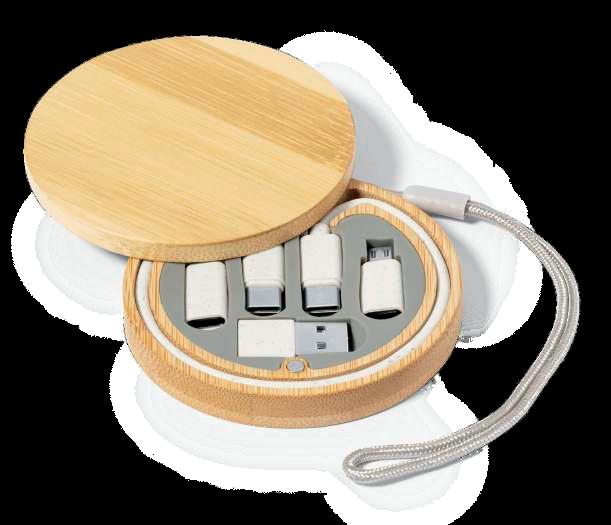 Complete charging cable set made of wheat straw, with polished bamboo case and carrying handle. Including cable with data transfer capability and multiple connections, with Micro USB, Type C and Lightning heads. 5V DC 3A..