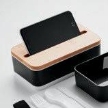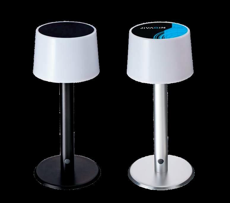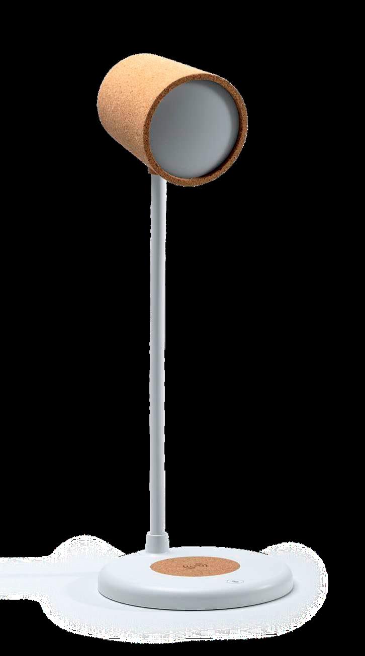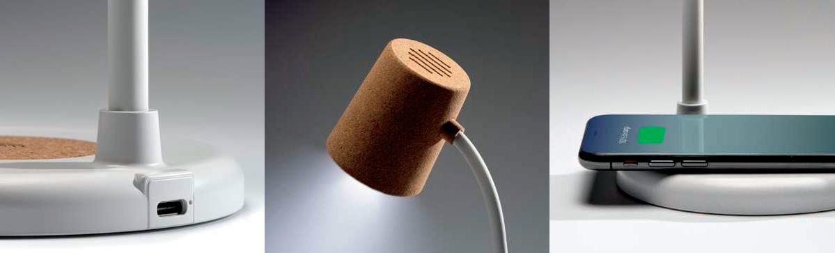 Table lamp with details in cork, with in-built 10W wireless charger on the base and 3W wireless speaker. LED light with three lightning modes