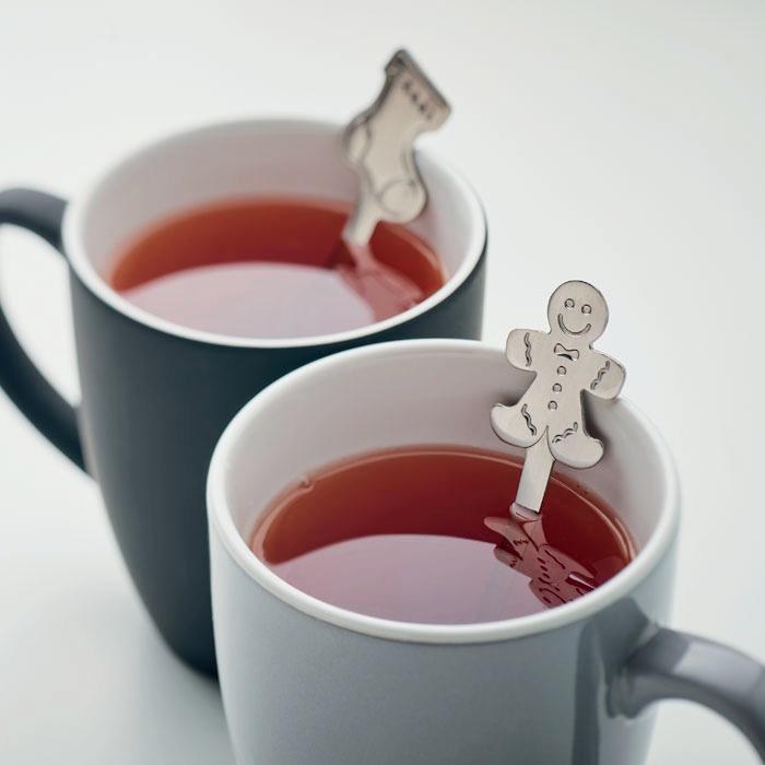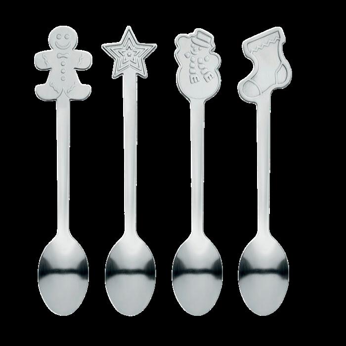 Set of 4 different stainless steel Christmas motif tea spoons. Presented in giftbox.