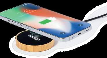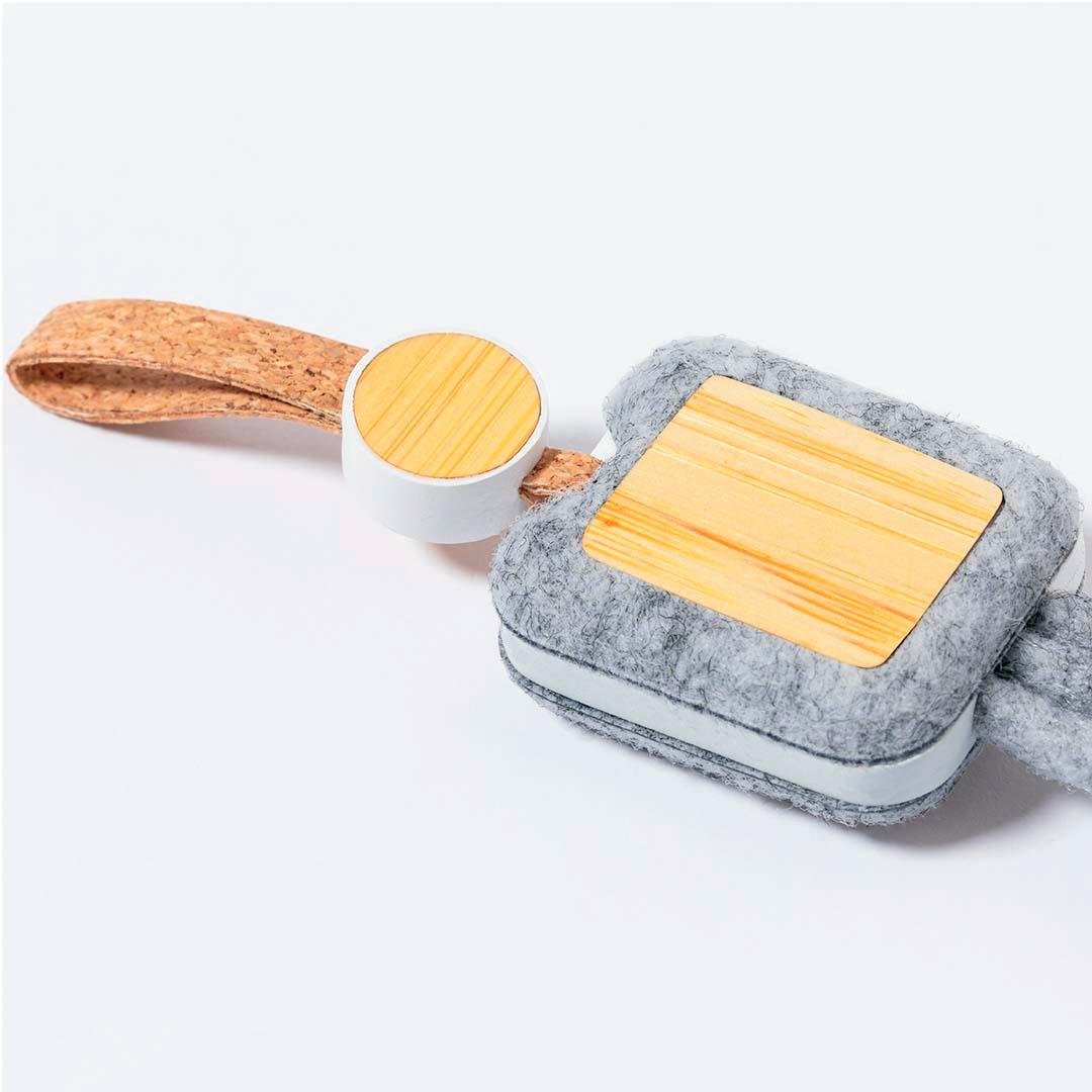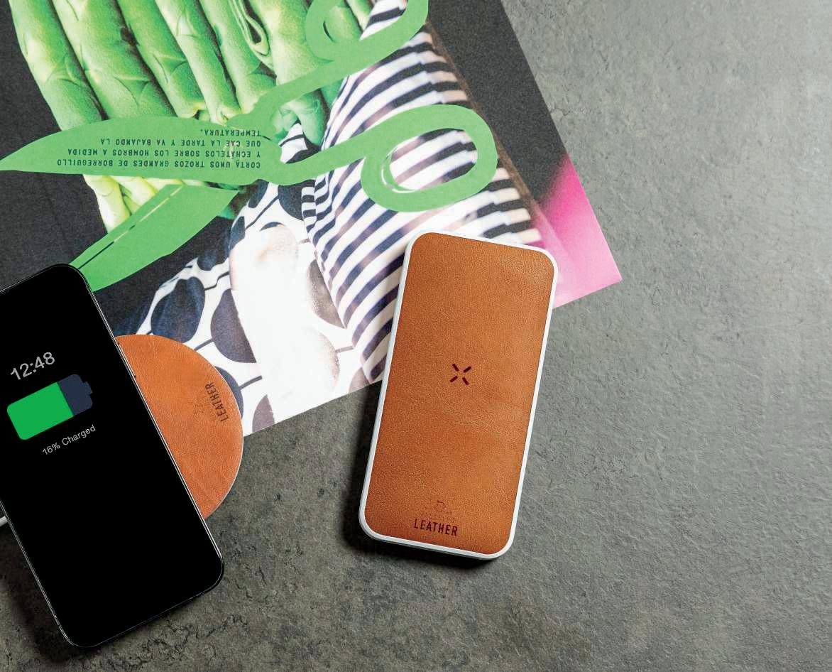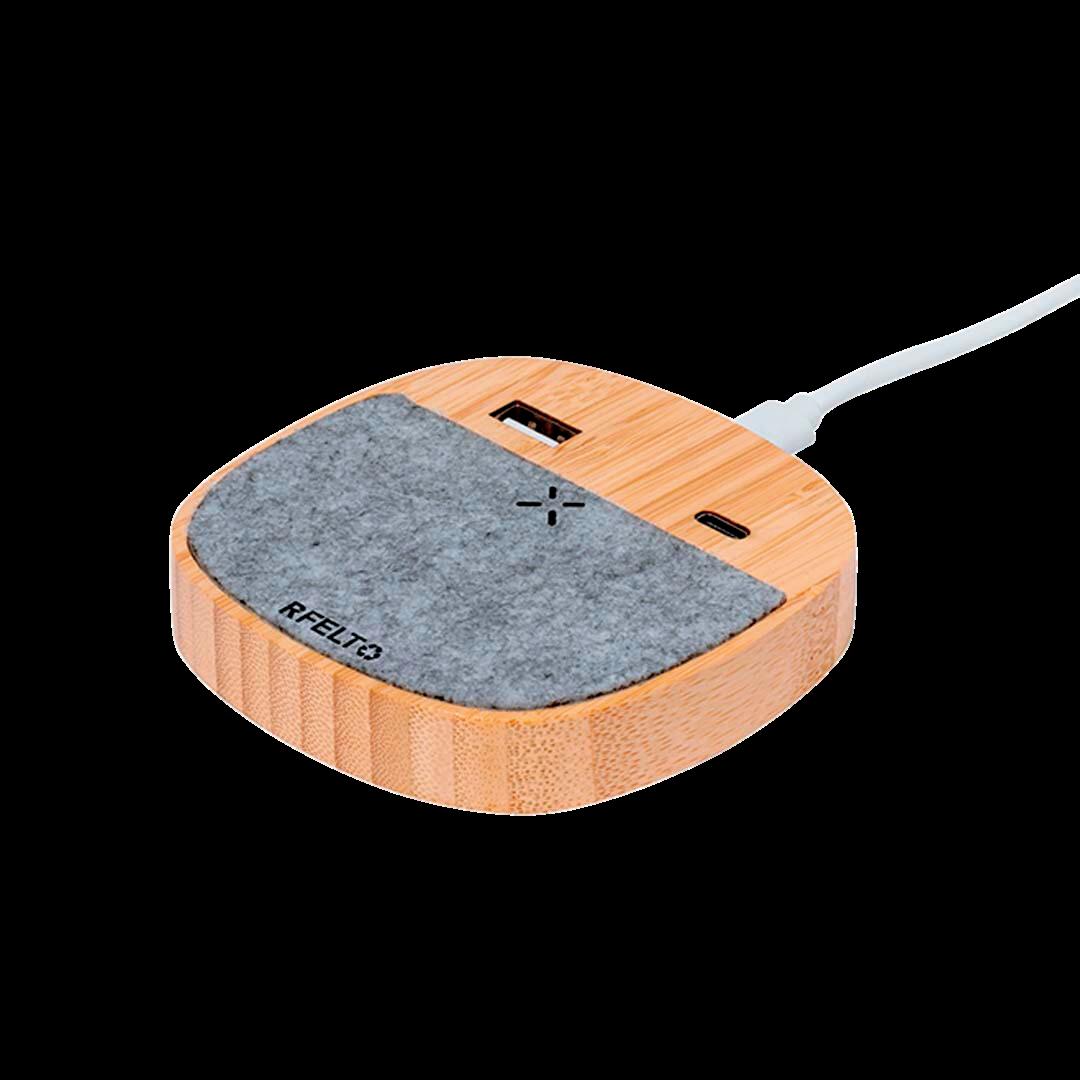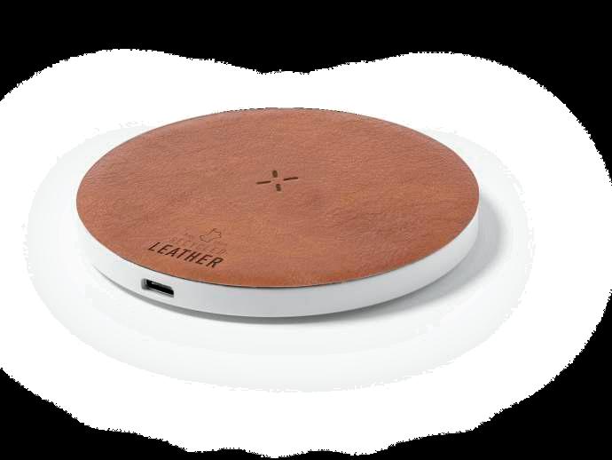 15W wireless charger, made in a combination of RABS and recycled leather. Compatible with devices equipped with Qi wireless charging technology With non-slip base, including Type C charger cable and instruction manual in English and Spanish. Presented in an individual kraft design box.