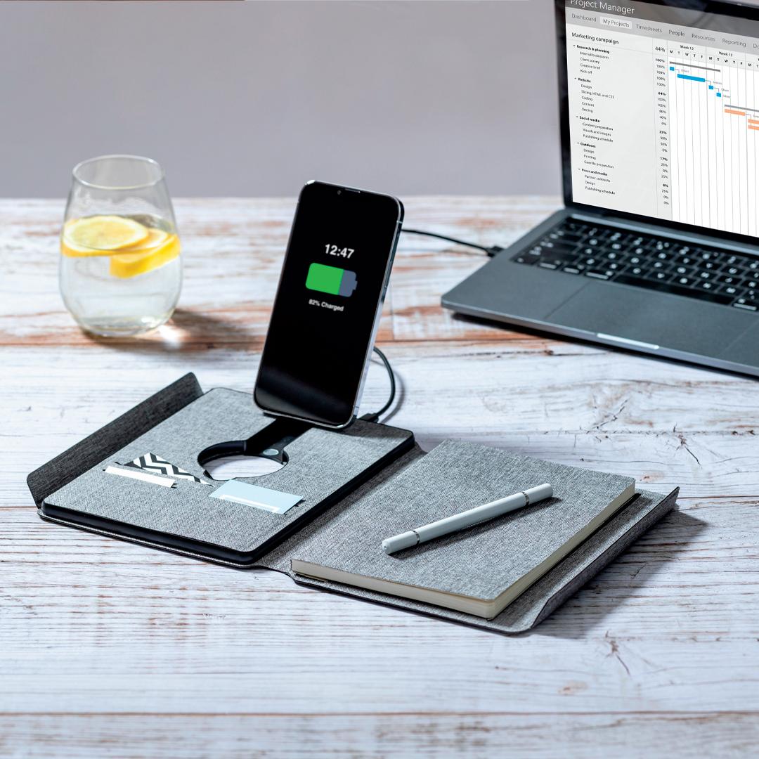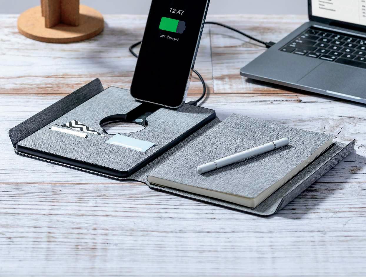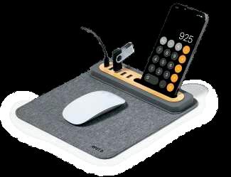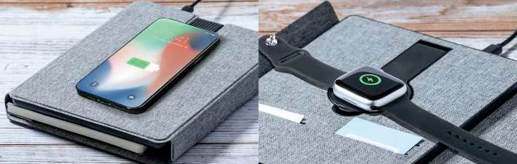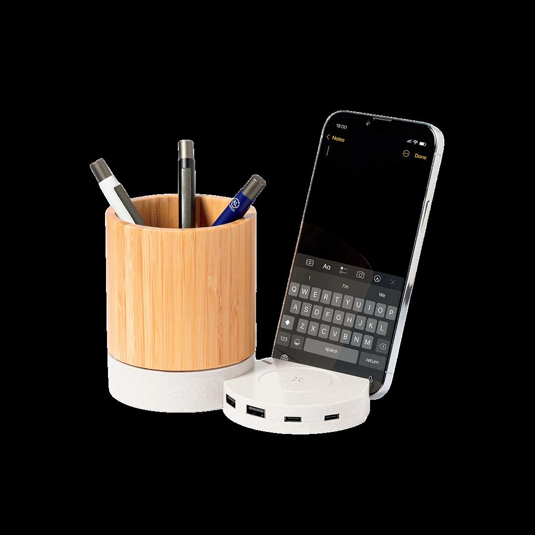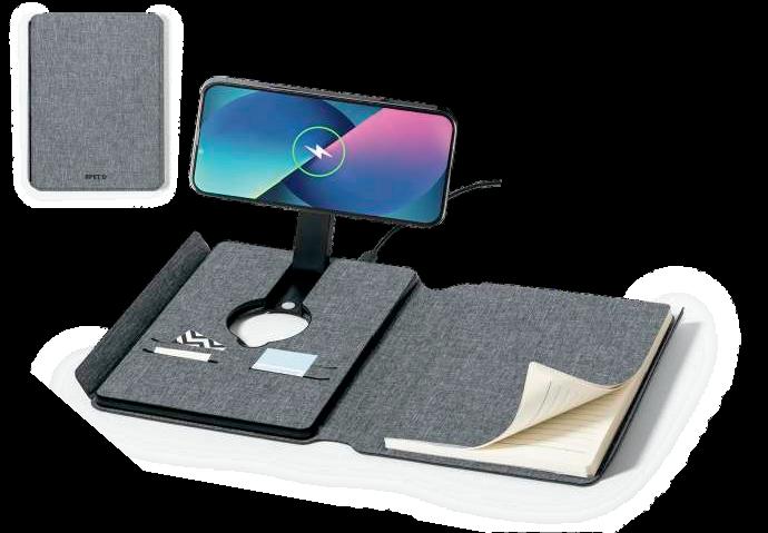 15W wireless charger, made in a combination of RABS and recycled leather. Compatible with devices equipped with Qi wireless charging technology With non-slip base, including Type C charger cable and instruction manual in English and Spanish. Presented in an individual kraft design box.