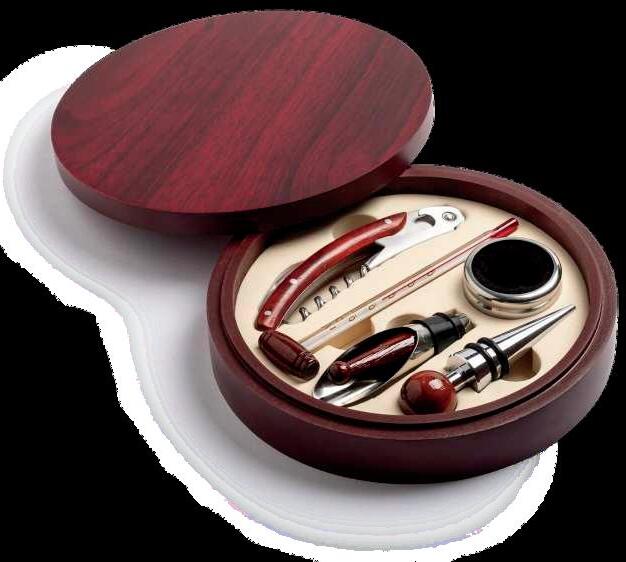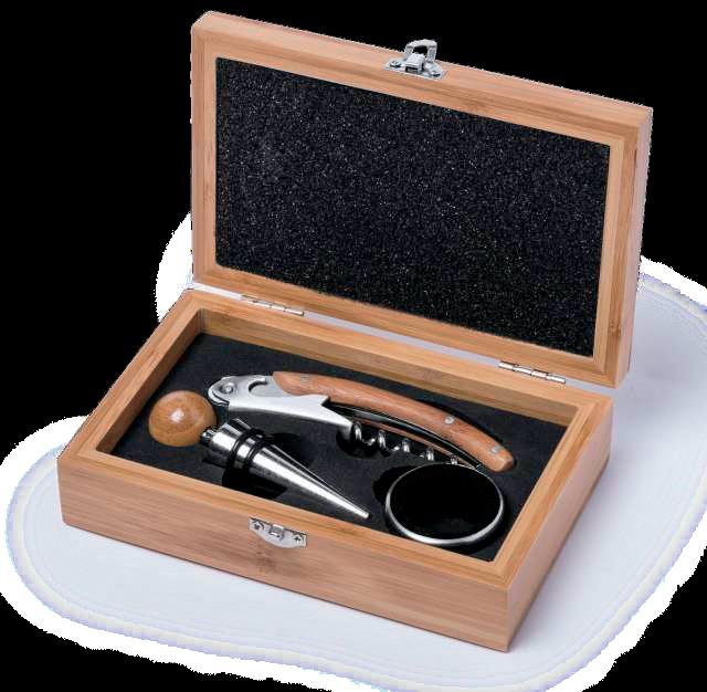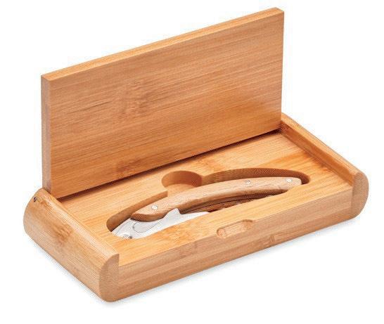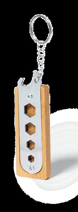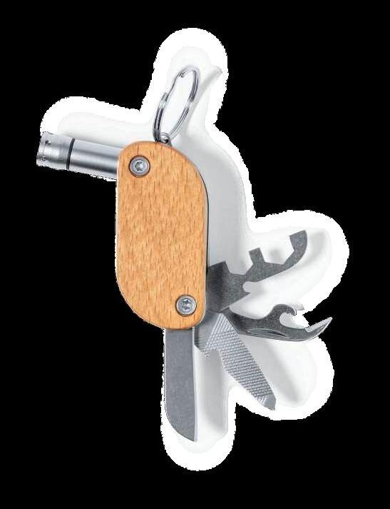 Handy multi-tool key ring made in resistant stainless steel and wood. With 9 functions: screwdriver, bottle opener, knife, can opener, file, several bits and one led torch.