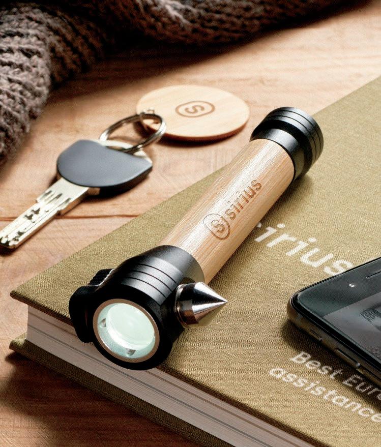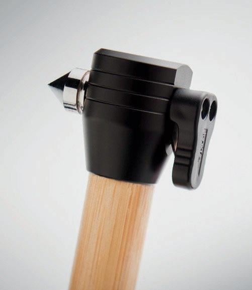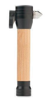 3 in 1 bamboo torch with safety hammer and seat belt cutter. It has a magnetic base. Output lumen: 60. 2 AAA batteries excluded.